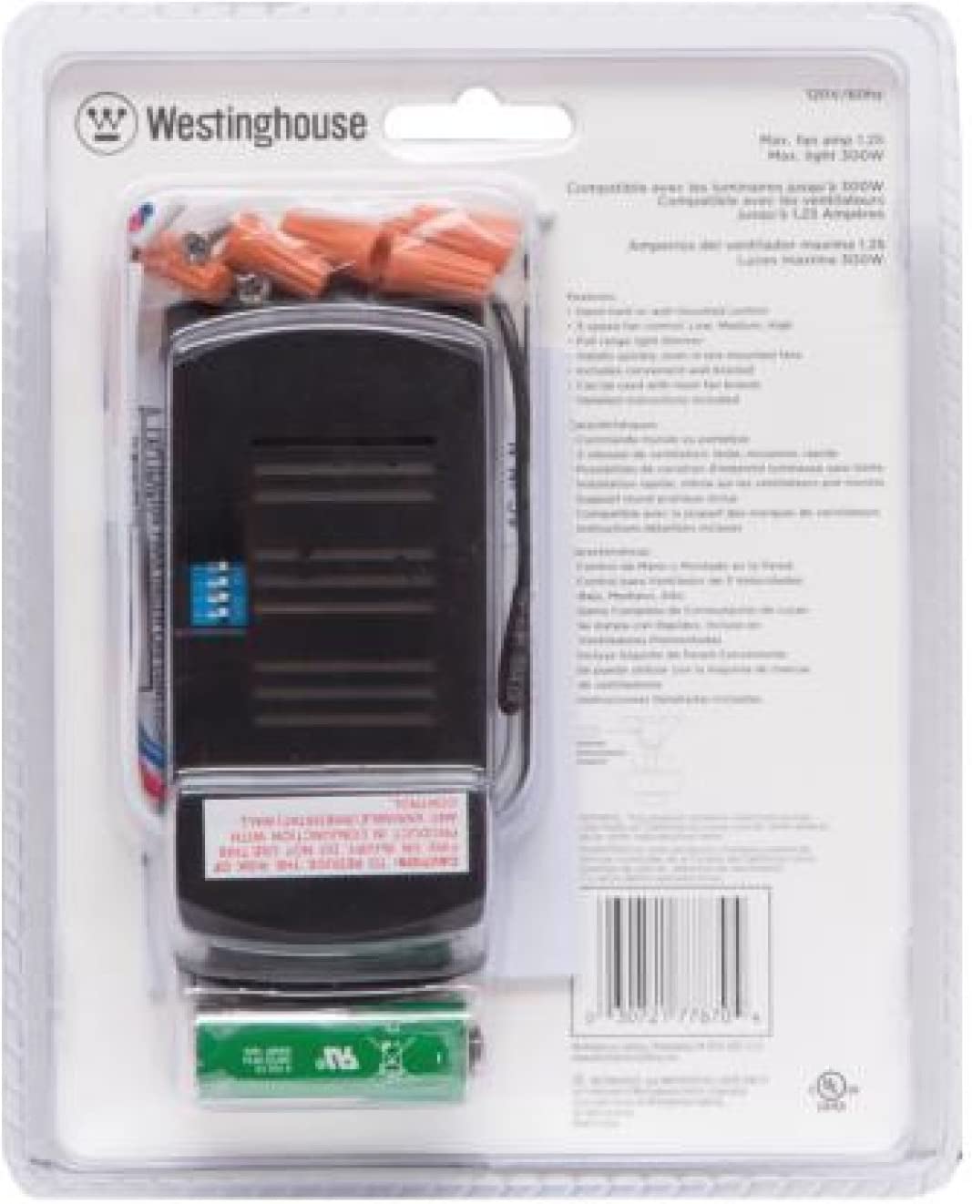 Hand-held remote control provides 3-speed fan control and variable light dimming. Operates up to a distance of 40'. Compact design conceals in fan canopy, installs easily on any new or premounted ceiling fan. Adjustable frequency setting eliminates interference. Silent operation. Wall mounting bracket included. Uses one 9V battery (included). UL listed.