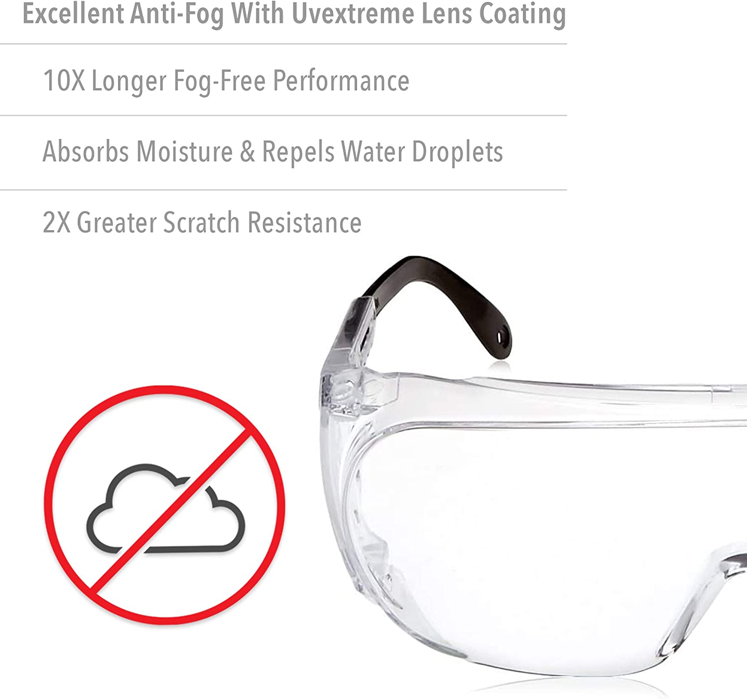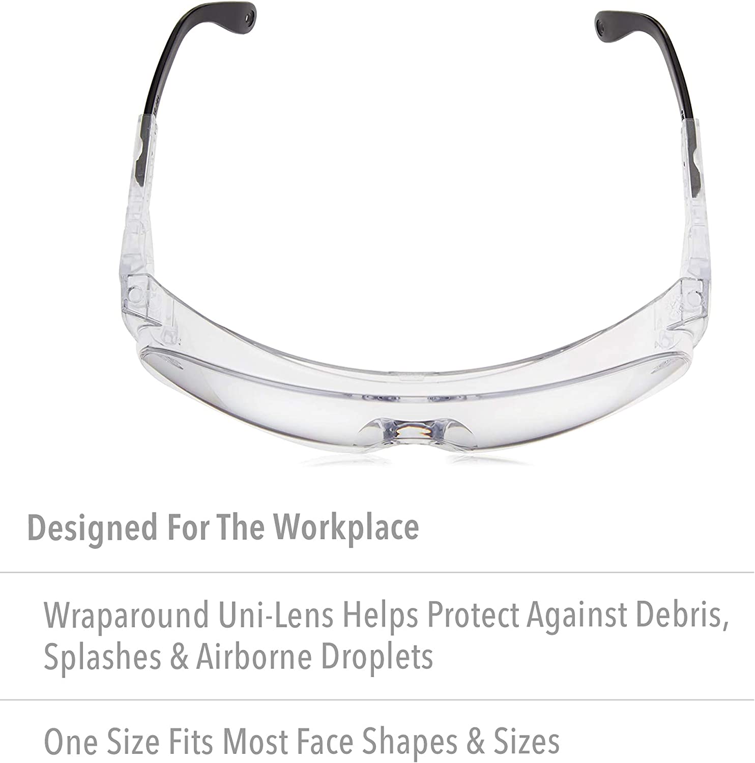 • SAFETY and COMFORT: Wraparound uni-lens design and built-in side shields protect against flying debris, splashes, airborne droplets etc.; side shields feature venting for better airflow and comfort; adjustable temple length ensures comfortable, custom fit