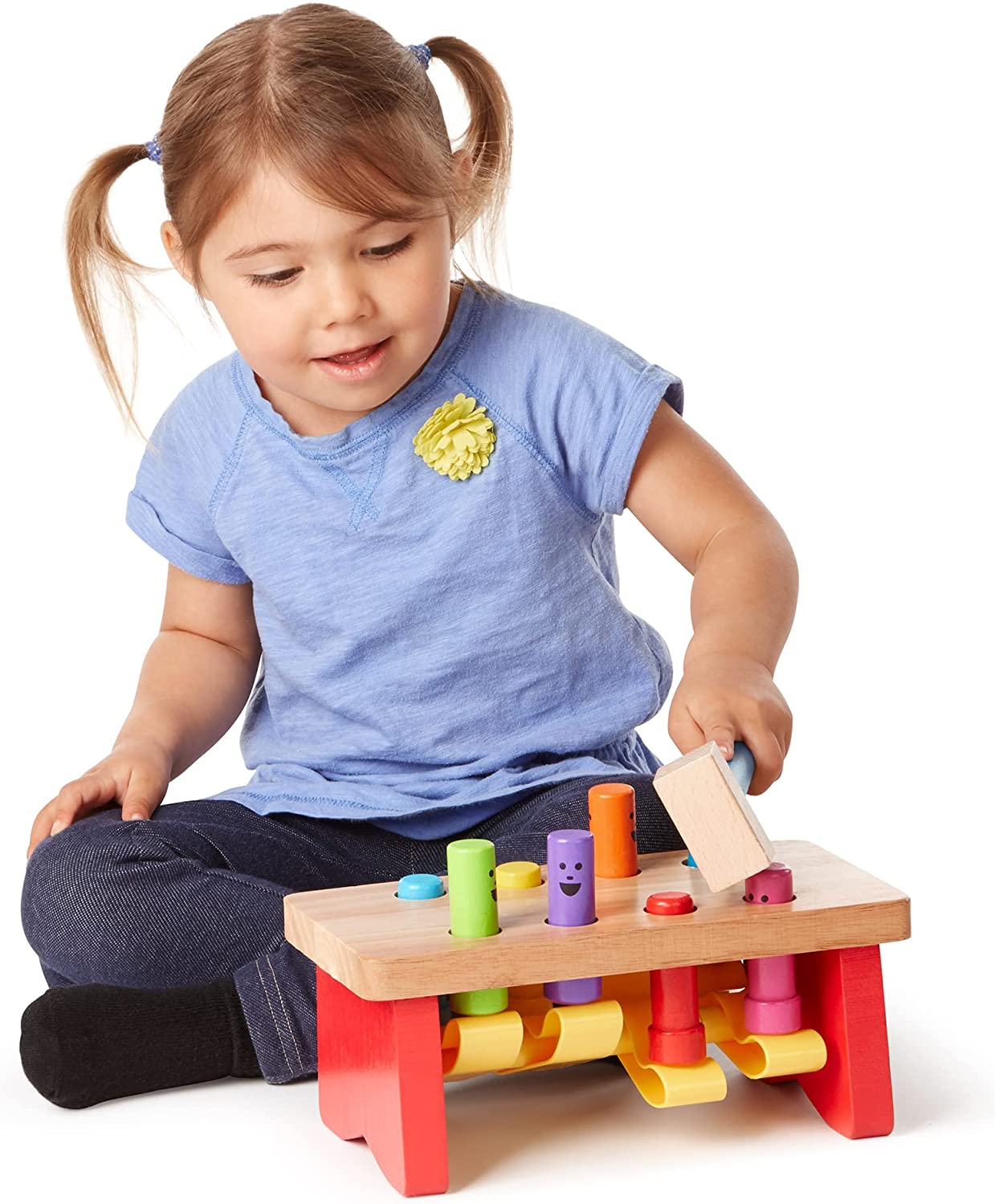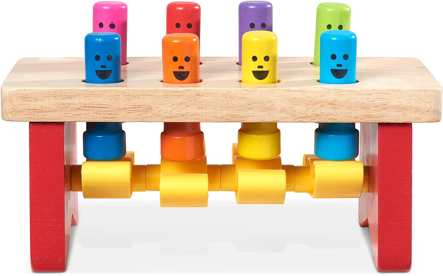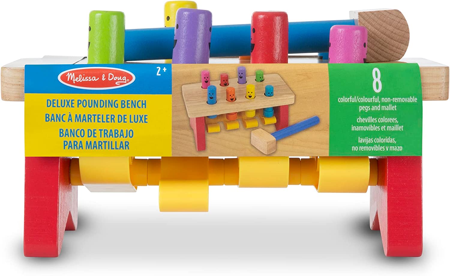 A beloved classic toy gets an exciting new twist with this deluxe pounding bench. As the colorful, non-removable pegs on the bench go up and down, they play peekaboo, taking turns showing their friendly smiles while the child has fun practicing fine motor skills. And you’ll enjoy that because the pegs are attached, they can’t get lost. A sturdy wooden mallet is included. Children delight in striking a peg with the mallet and watching one on the opposite side pop up. Once kids have seen this cause-and-effect in action, they will enjoy predicting which peg will pop up next. As they develop hand-eye coordination and fine motor skills, they will also be learning numbers and colors by counting the pegs and naming each color as it pops up. The Melissa & Doug Deluxe Pounding Bench Wooden Toy makes a great gift for kids 2 to 4 years. This product measures 5.25" H x 10" L x 5" W and includes a sturdy wooden mallet. Add the Melissa & Doug Wooden Latches Board to round out the developmental play and learning experience. For more than 30 years, Melissa & Doug has created beautifully designed imagination- and creativity-sparking products that NBC News called “the gold standard in early childhood play.” Today, Melissa & Doug is proudly partnering with the American Academy of Pediatrics to foster early brain development and help children build important life skills through play.