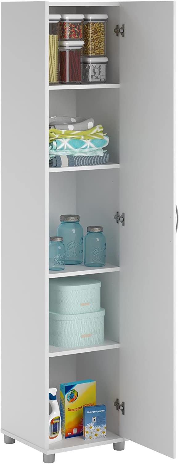 • The 5 shelves, 3 adjustable, can store and organize your cleaning supplies and even kitchen pantry items. Soft closing hinges prevent slamming doors. Adjustable feet keep your cabinet level on uneven floors