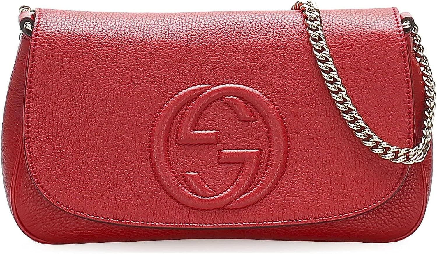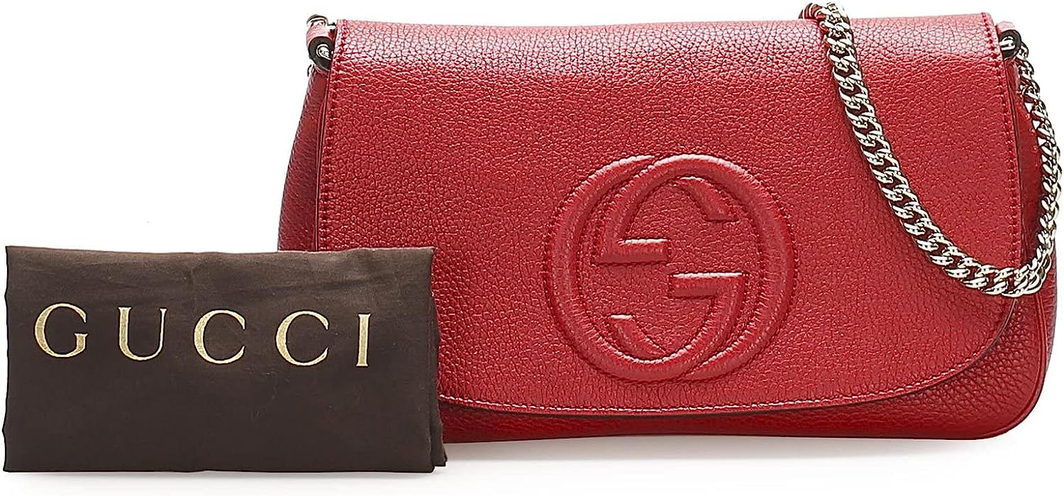 • Gucci Soho Interlocking GG Red Leather Chain Flap Shoulder Bag. This beautiful embossed red crossbody is the perfect bag for any everyday look or dressed up for a night out.