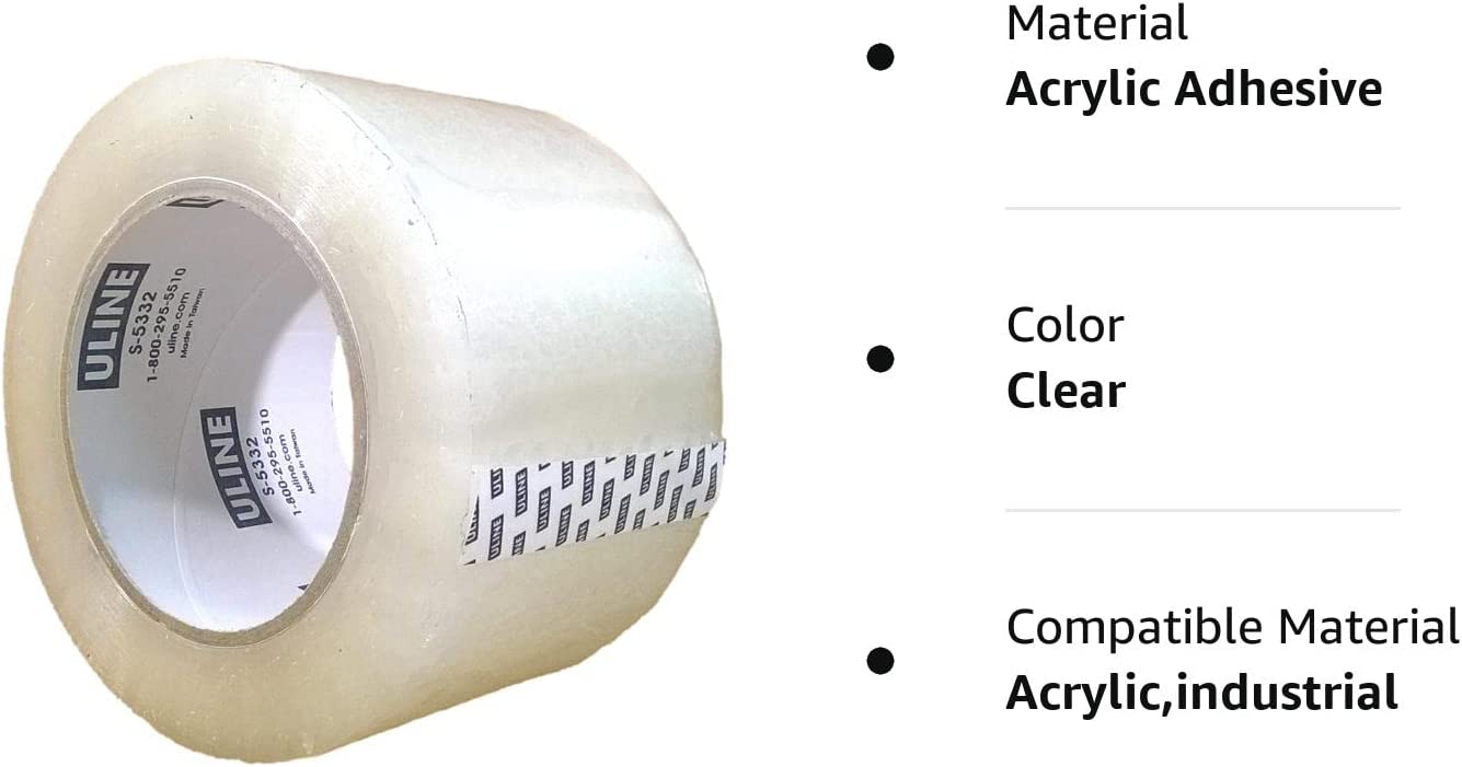 Uline tape S-5332 - Tough solvent acrylic adhesive for a secure hold. 26 lbs. per inch tensile strength. Recommended for use on shipments over 40 lbs.