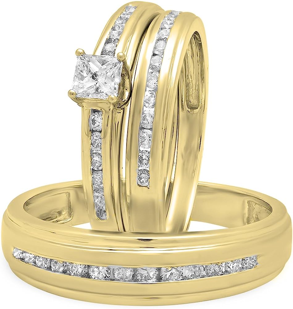 Dazzlingrock Collection Princess & Round White Diamond Square Frame Head Tapered Shank Elegant Wedding Trio Ring Set for Him & Her 7/8 CT (0.85 ctw, Color I-J, Clarity I2-I3) in 10K Gold