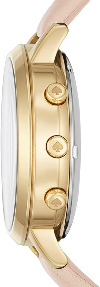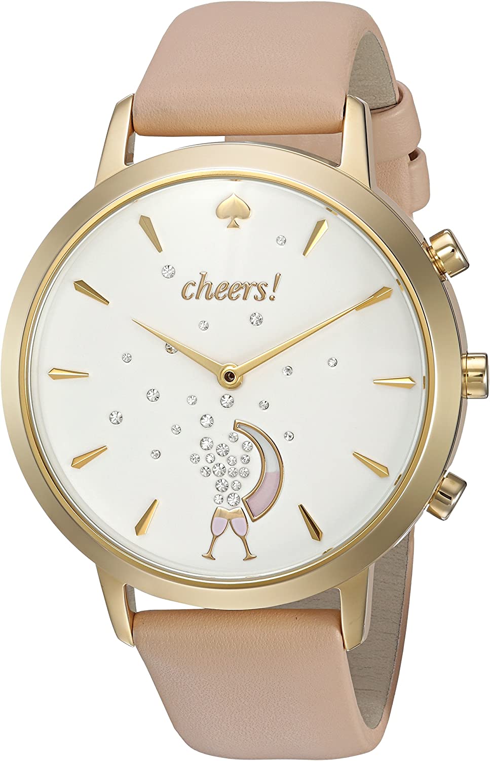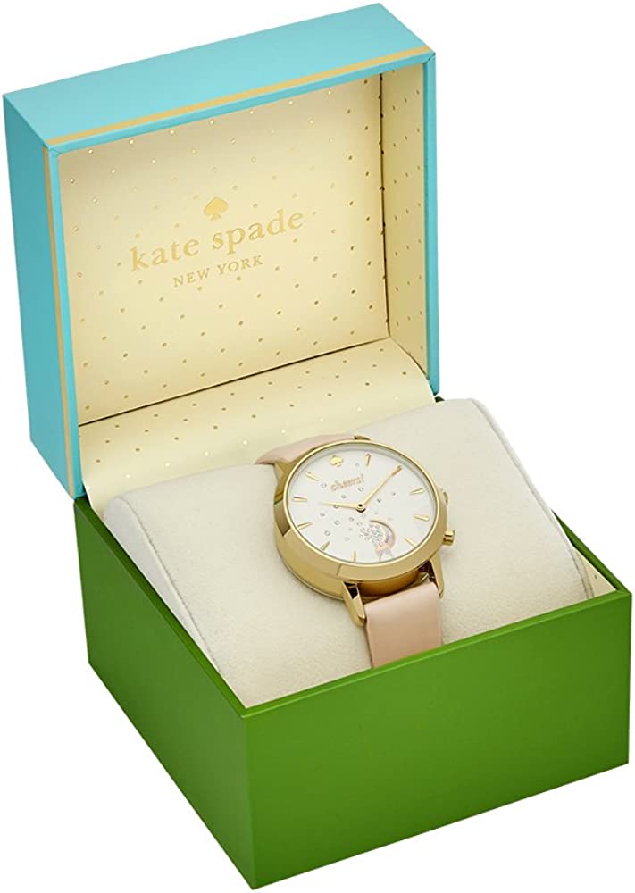 Your watch alerts you with light notifications, controls music, automatically updates time zones, takes selfies and never needs charging. And, with a vachetta leather strap, gold-tone case and classic white dial (with champagne glasses spouting crystal bubbles at the six o'clock index), it's as chic as it is functional. Compatible with Android OS 4.4+ or iPhone 5/iOS 8.2+ and bluetooth smart enabled / 4.1 low energy. The battery life can be up to 6 months and your package includes a caseback changing tool.