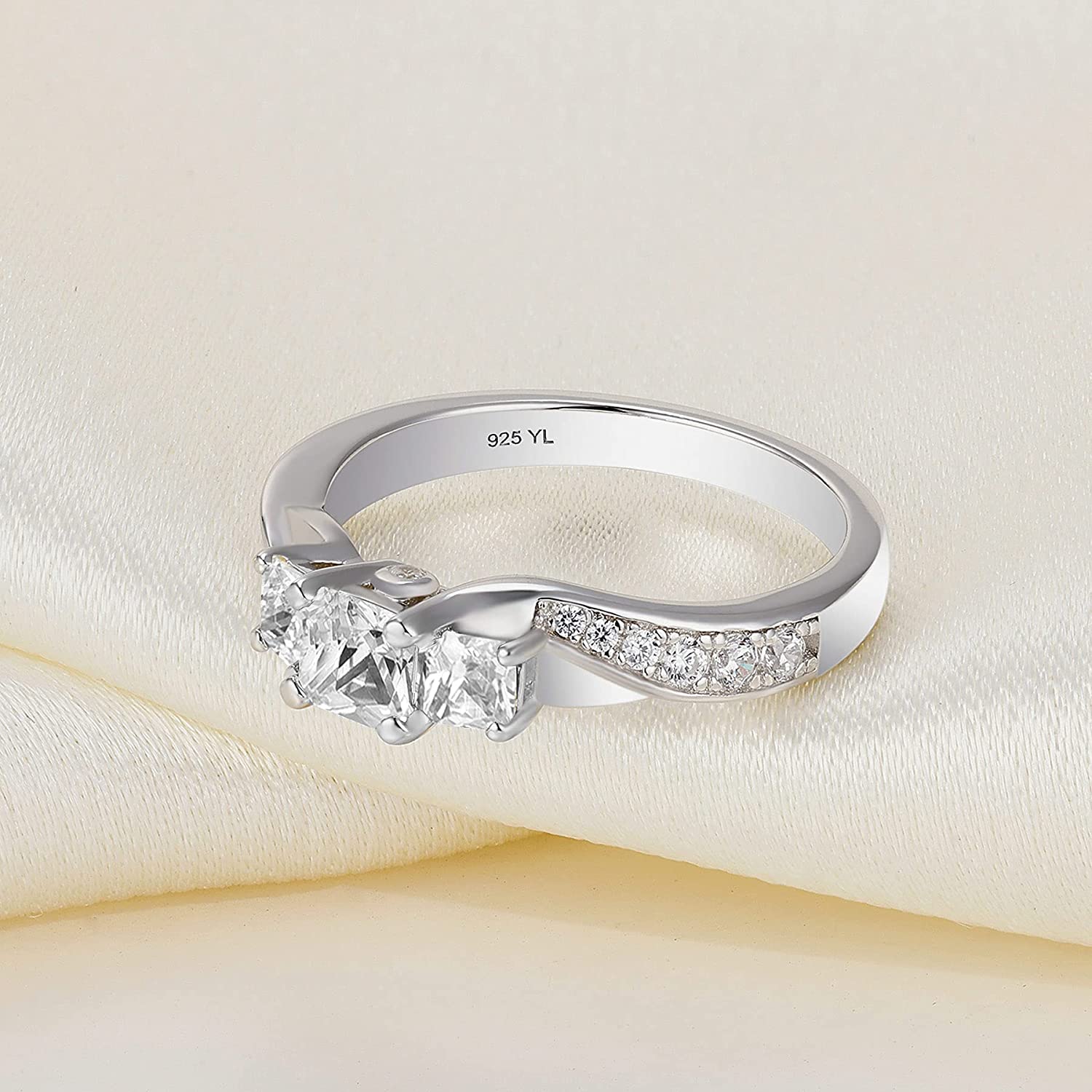 YL Women's Sterling Silver Clear Birthstones 3-stone Princess Cut Wedding Rings for Engagement Jewelry