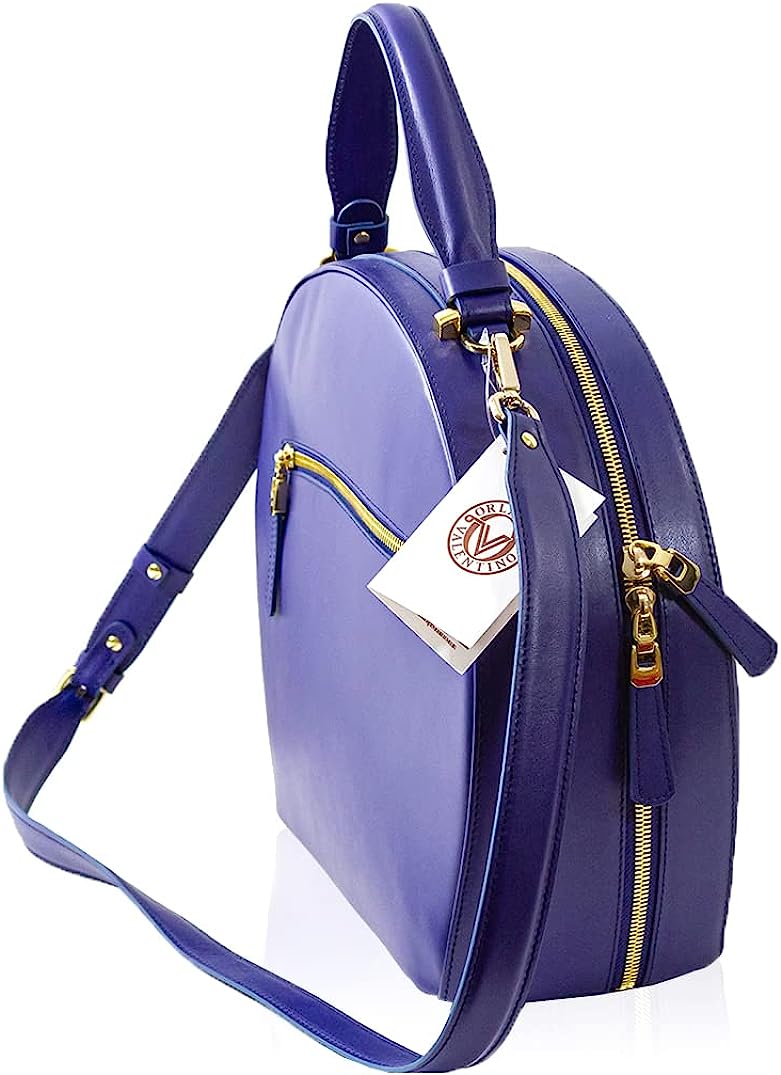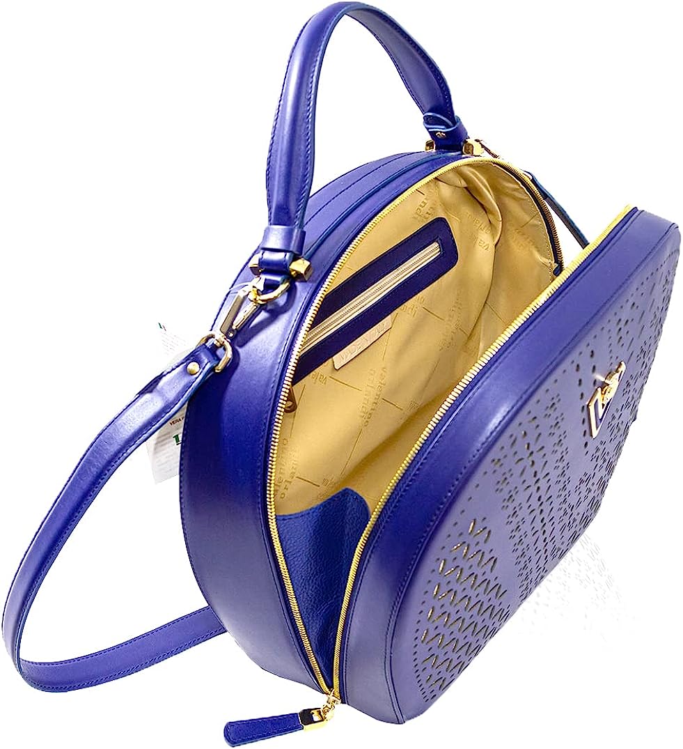 • The new collection Valentino Orlandi offers unusual combinations and refined original styling with careful attention to detail. This is a collection for a sensual and romantic woman. Turn heads and stop traffic with on trend circle shape made of laser cut hand embroidered design backed by gold leather in decadent tanzanite blue color. Featuring Swarvoski encrusted famous "V" logo. Easy to access main compartment will hold all your daily necessities.