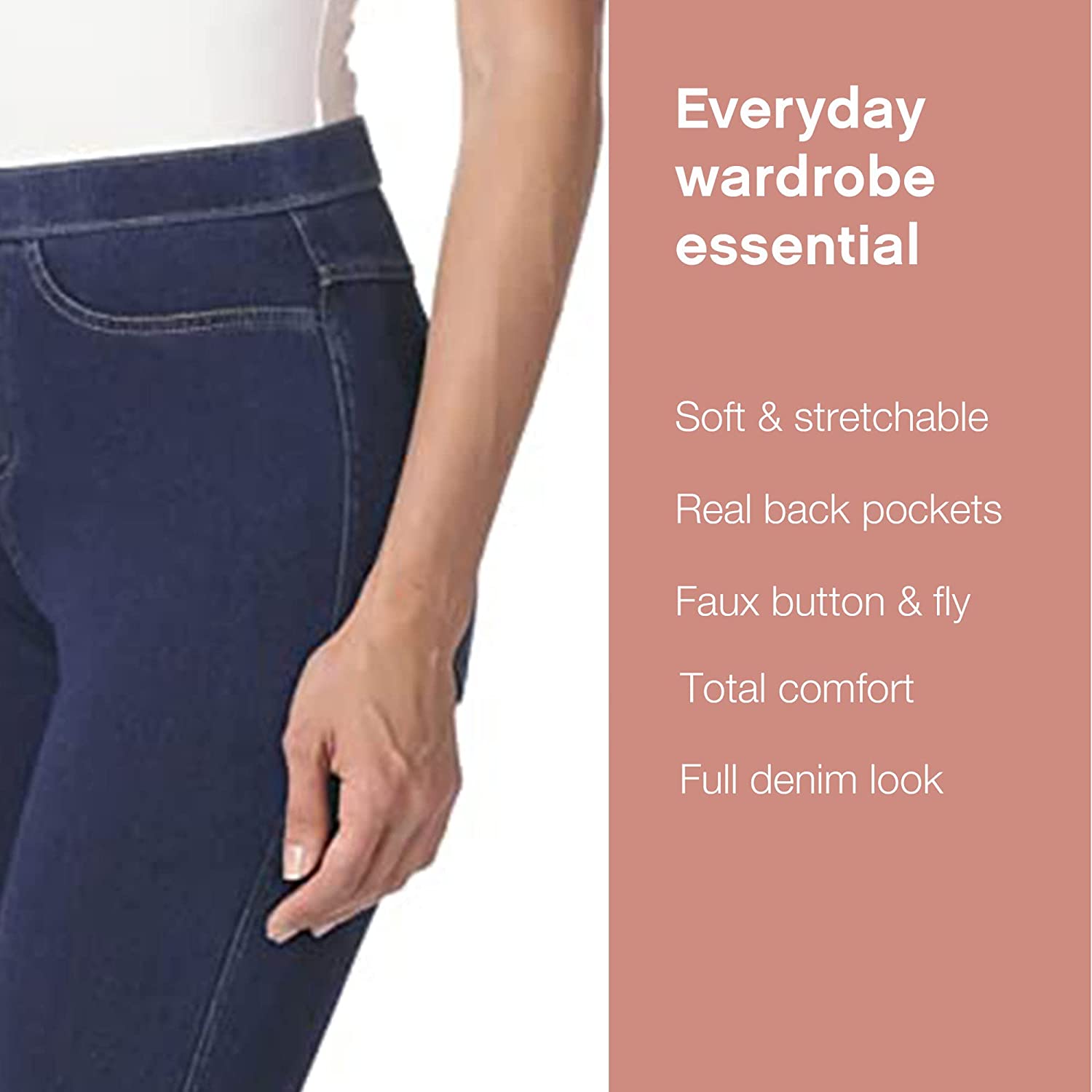 • With the look of denim and the total comfort of leggings, these jeggings feature authentic jean styling with faux front pockets, faux fly, and real back pockets
