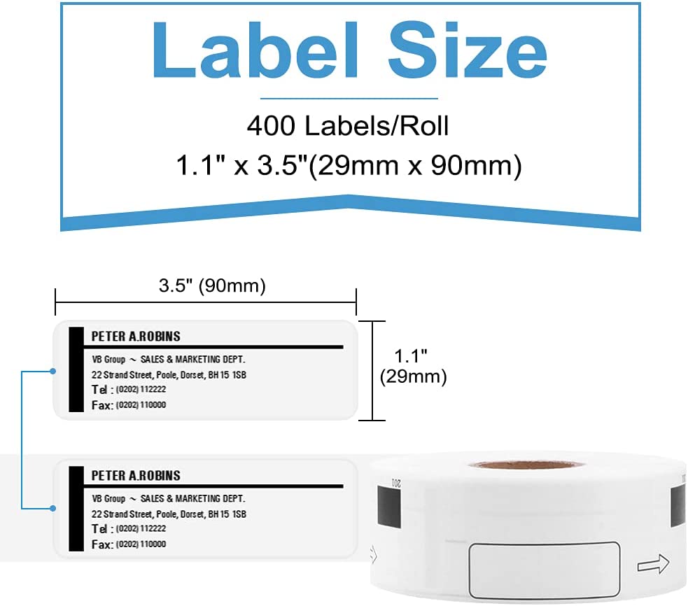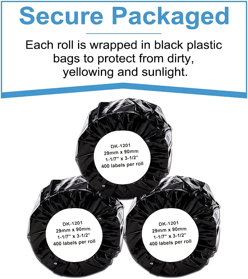• Specifications: 29mm x 90mm (1-1/7” x 3-1/2”) replacement for Brother DK-1201 labels - 6 Rolls white die-cut standard address labels (400 Labels each roll, in total 2400 labels) with 1 refillable cartridge