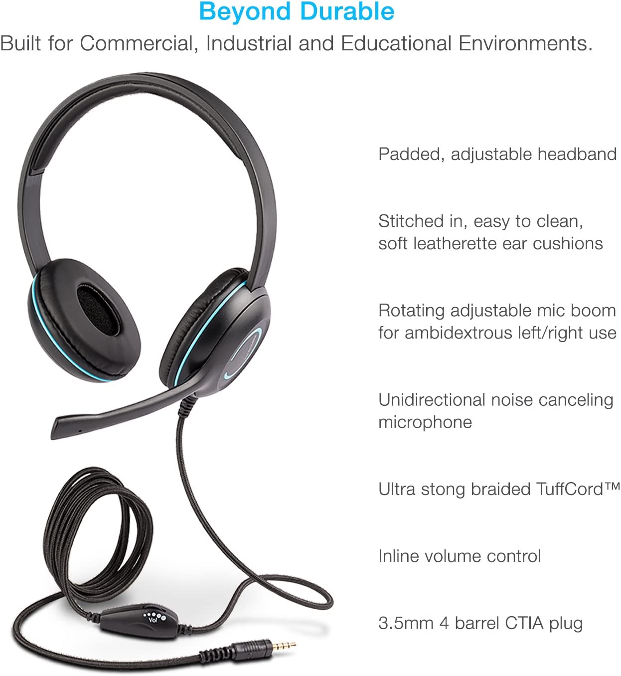 Durable Design: Adjustable headband with easy to clean leatherette earpads. Headset and tangle free braided TuffCord cable are designed for hard wearing and to be long lasting.