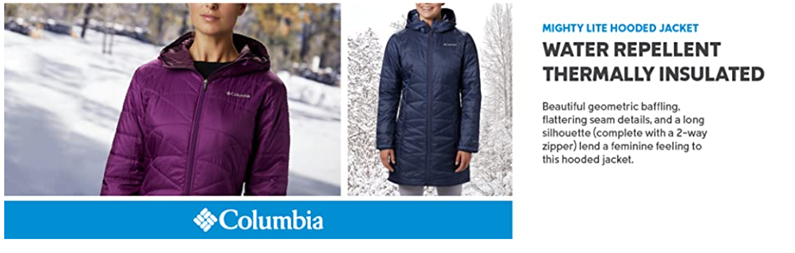 - COZY WINTER JACKET: The Columbia Women’s Mighty Light Hooded Jacket is a performance blend of advanced water repellency and ultra lightweight warmth that only our thermal heat reflective lining can provide. Your go-to coat for a wide range of adventure