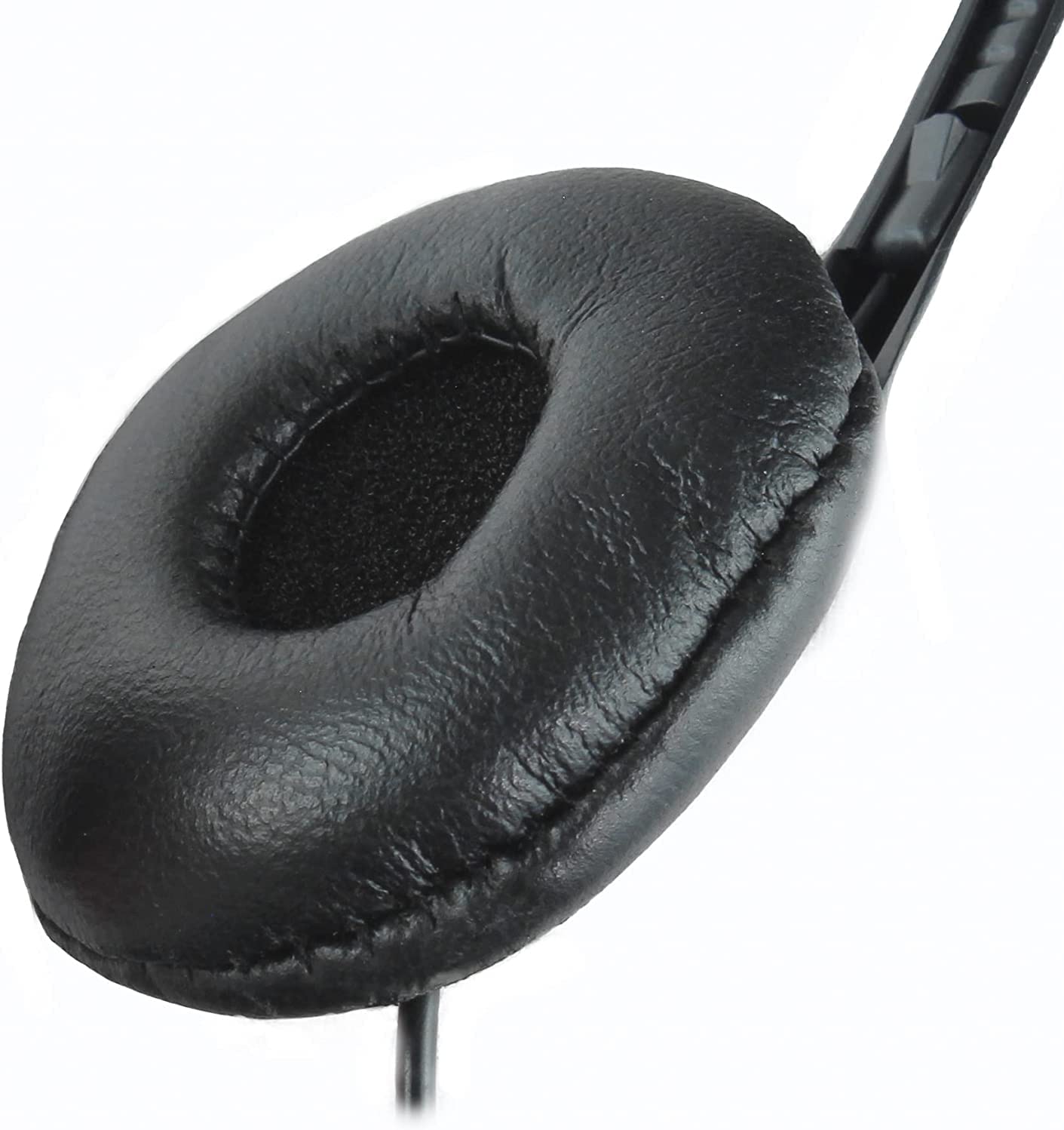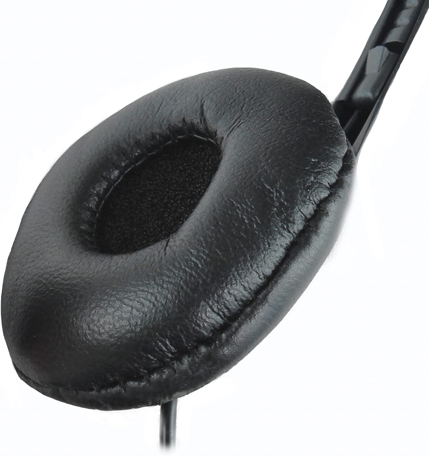 • Leatherette ear pads are comfortable to wear for extended use and plastic headband is adjustable to fit a range of head sizes