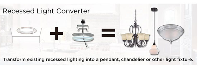 This unique patent-pending Westinghouse Recessed Light Converter offers an easy way to transform your existing recessed lighting into a pendant or light fixture with no major remodeling. Let your creativity inspire you to update your home lighting with this quick and easy upgrade. Hang any pendant or other light fixture of 50 pounds or less where recessed lighting is currently used in your home.The Recessed Light Converter adjusts to any can size between 4-inch and 6-inch, there are no visible screws or hardware and the decorative medallion can be painted to match any decor. This converter works with existing recessed cans that use medium base PAR16, R16, A19, R20, PAR20, BR25, BR30, R30, PAR30, BR38, PAR38, BR40 or R40 light bulbs and is suitable for damp locations.Perfect for kitchens, family rooms or anywhere recessed lighting is used. It includes a versatile white decorative medallion, adjustable bar, socket adapter and mounting hardware for convenient installation.This Westinghouse Recessed Light Converter is CETL listed for safety.Product reference number 01011.