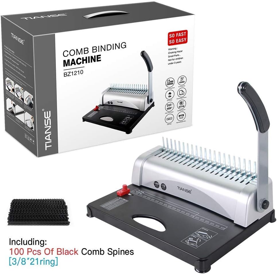 - 【Great Value for Money】: Our binding machine comes with 100pcs of 3/8'' 21-ring black PVC comb spines starter kit, no need to buy separately, save your money. Solid metal housing, non-slip feet, high-leverage arm for punching. Manually punches up to 12 sheets of 80g(paper thickness≈20lb) paper at a time, binds up to 450 sheets. (2'' comb plastic bindings)