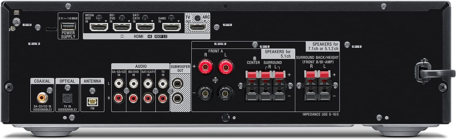Give your home entertainment system a cinematic upgrade. The powerful 7.2 channel receiver supports the latest three-dimensional surround sound audio formats including Dolby Atmos and DTS: x, drawing you into the middle of the action you see on screen. And with 4K Ultra HD picture quality, and Dolby Vision, that’ll transform your viewing experiences, you’ll enjoy an immersive theater-like experience in the comfort of your own home. Input Output Terminals: Audio Input Opt (1), Audio Input Coax (1), Analog Audio Input (4), Pre Out Subwoofer (2), Headphone Output (1), USB (for power supply only).