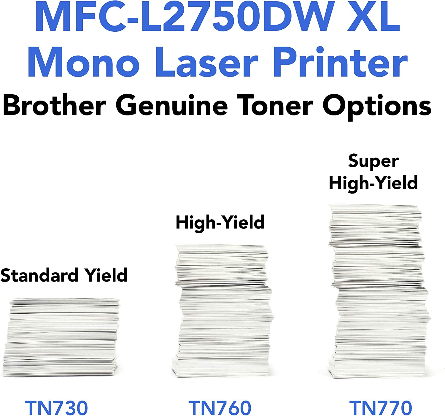 This new all-in-one laser printer also offers a “Touch to Connect” feature for printing and scanning with NFC, which increases convenience. Users can print-from and scan-to multiple cloud-based services, directly from the 2.7” color touchscreen, including Google Drive, Dropbox, Evernote, OneNote, and more. This all-in-one is designed with a 250-sheet paper tray that improves efficiency by requiring fewer refills. The MFC-L2750DW XL can handle letter- or legal-sized paper and prints with exceptional quality, regardless of the print size or font used. And we’ve added an up to two year supply of toner, including one high-yield and one super-high-yield cartridge. You can purchase replacement Brother Genuine high-yield toner (TN-760) or super high-yield toner (TN-770) conveniently on Amazon (also compatible with TN-730 replacement toner cartridge).