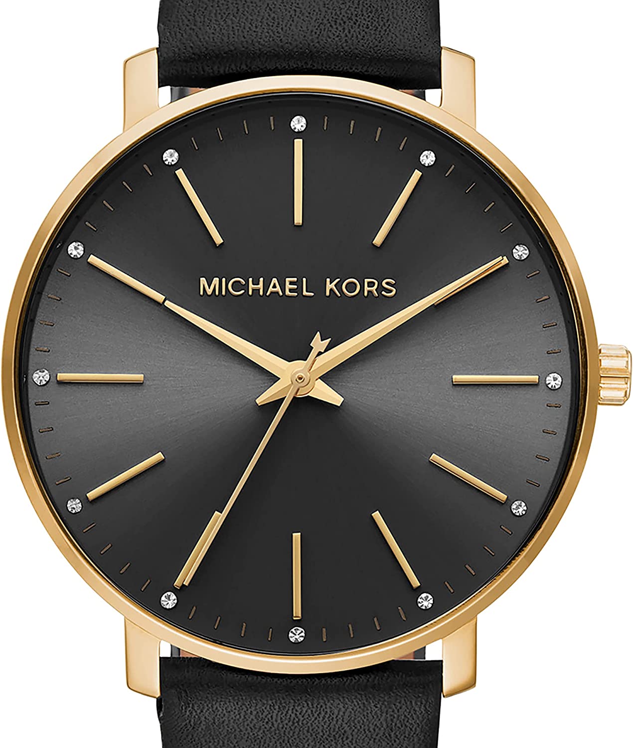 Watch Sizing Guide Find a confident ensemble with the addition of this sleek Michael Kors® Pyper watch. Stainless steel case. Leather strap with adjustable buckle closure. Round face. Three-hand analog display with quartz movement. Dial features gold-tone hands and hour markers, minute track, and Michael Kors detailing. Water resistant 165 feet. Display case included. Imported. Measurements: Case Height: 38 mm Case Width: 38 mm Case Depth: 7 3⁄10 mm Band Width: 17 mm Band Circumference/Length: 8 3⁄4 in Weight: 1.2 oz