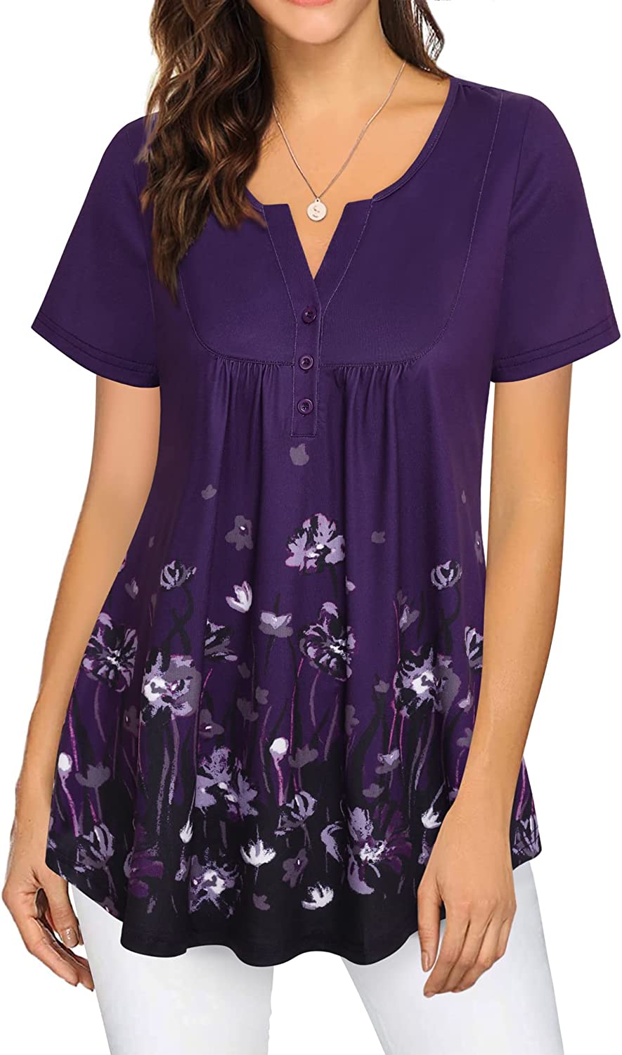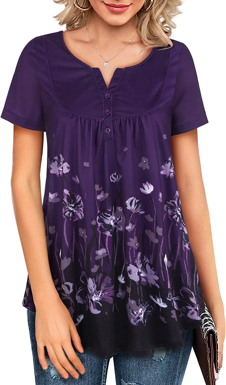 • Design: Henley v neck can let your neck line looks more slender and graceful.Besides, The looseness and ruffle details on the middle can hide the muffin-top perfecterly
