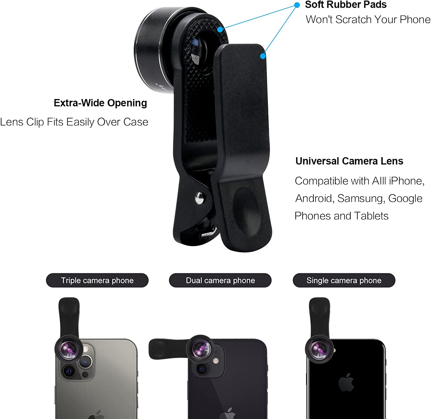 Portable and detachable universal lens clip design: Compatible with almost any smartphone including (but no limited to) iPhone 14, 13, 12, 12 Pro, 11, Xs, X, 8, 7, 6s, 6 plus, Samsung galaxy / note, iPads, Android Tablets, Huawei, HTC, LG G6 G5, Motorola, Sony, and many others. The lens works on both front-facing and rear-facing cameras