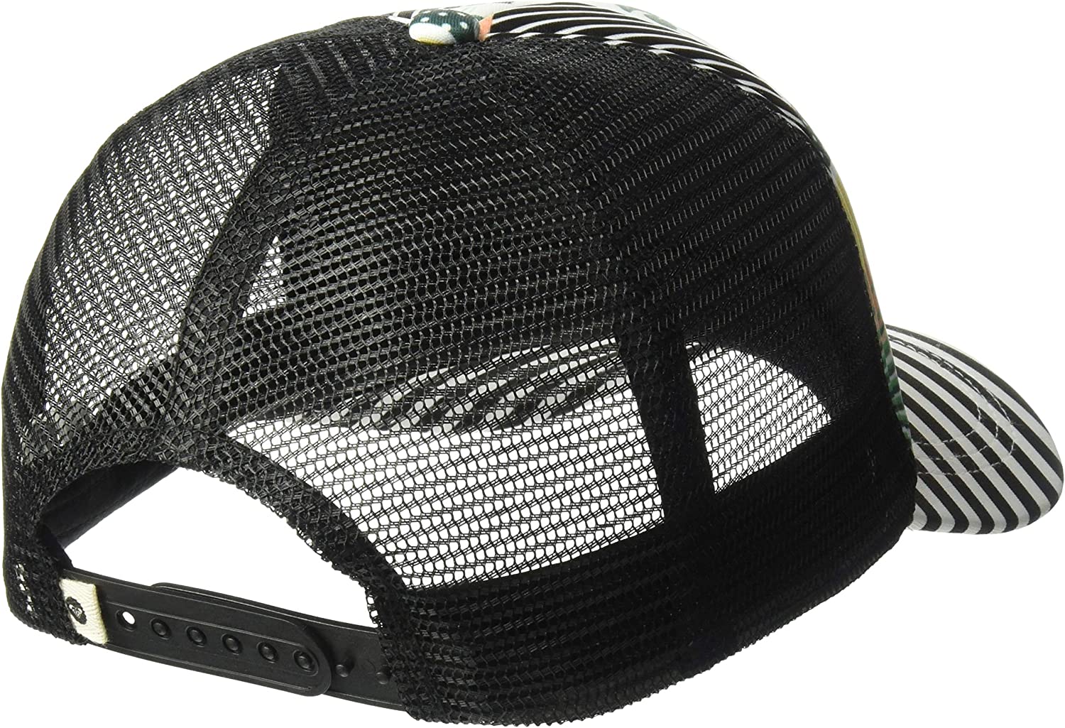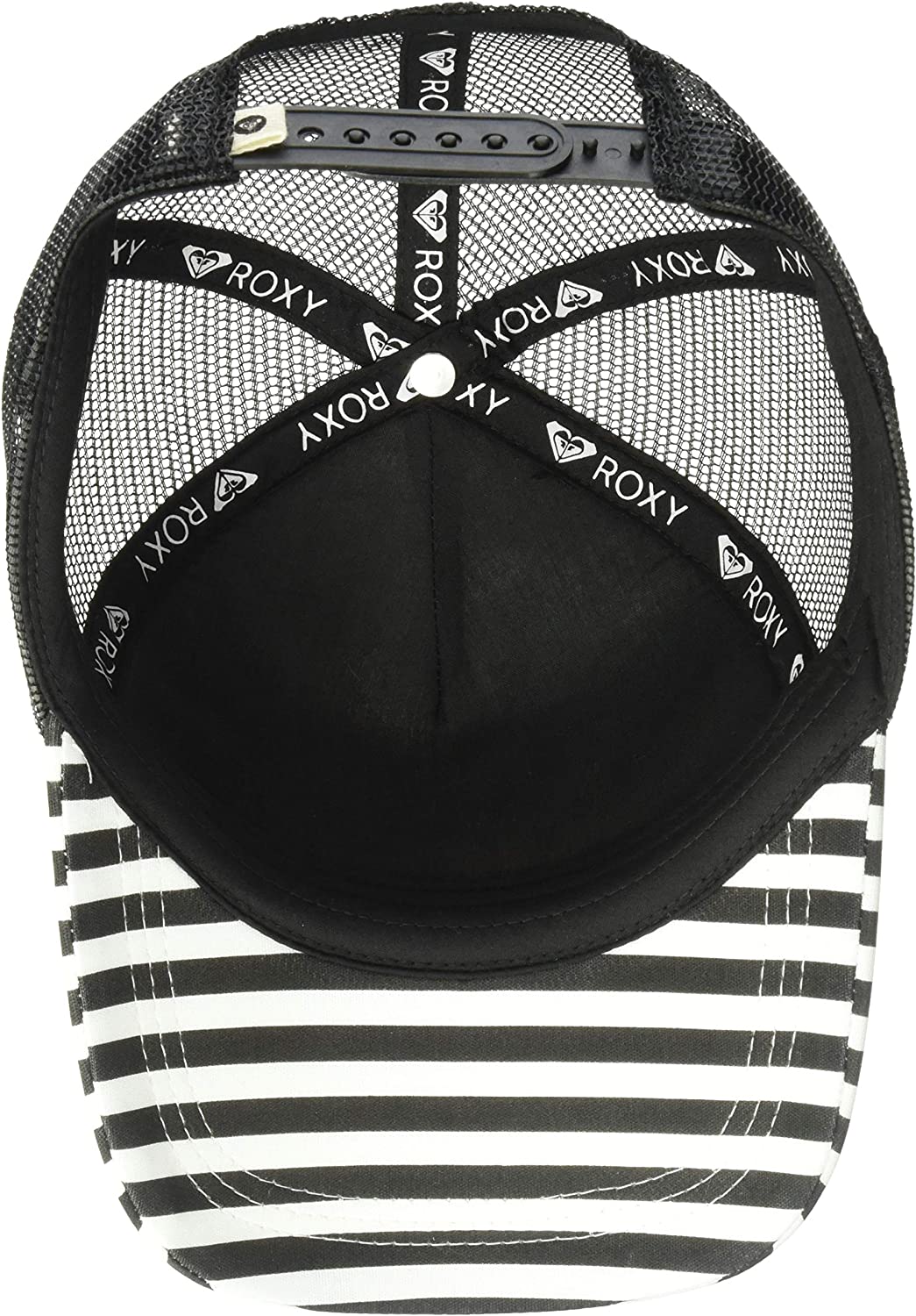 Roxy trucker hat for women. Features include: trucker design, printed front and brim, mesh back, adjustable back closure, printed heart logo and flag label.