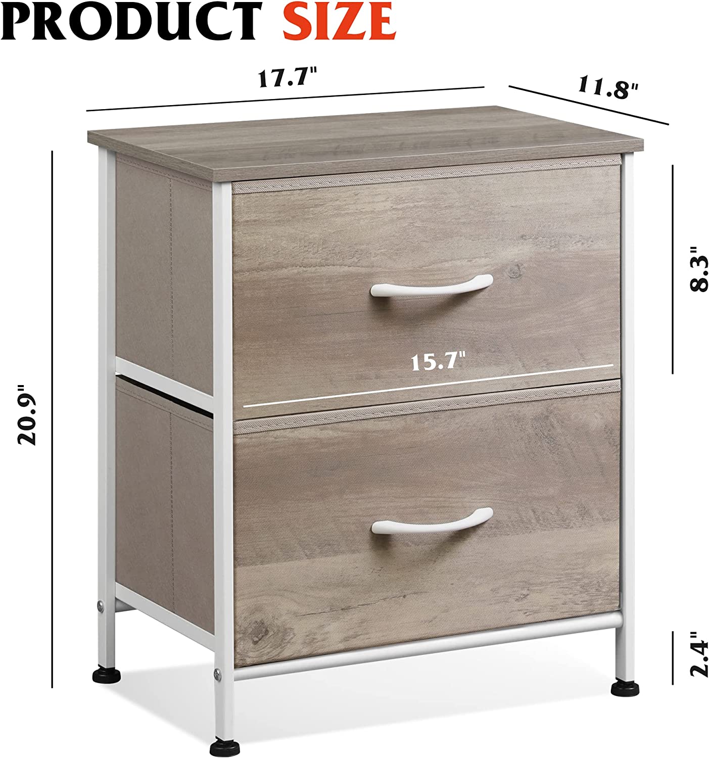 SPACIOUS STORAGE: The 2 fabric drawers of the small dresser offer large storage space for nighttime necessities. The wood top is ideal to place alarm clock, phone, charger, eyeglasses, keeping them in your reach.