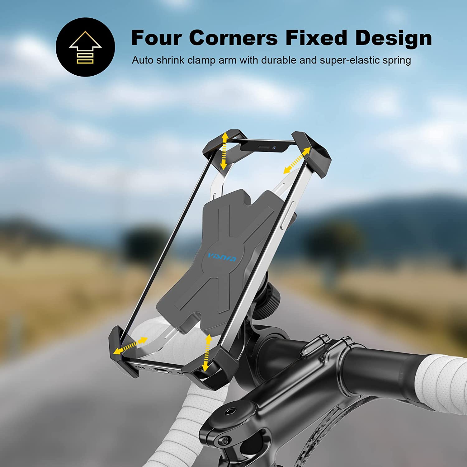 Sturdy and Secure: The Bicycle Phone Mount has 4 stainless steel clamp arms with support corners to ensure your phone stays securely attached to your Bike handlebars. Super Stability and Safety!