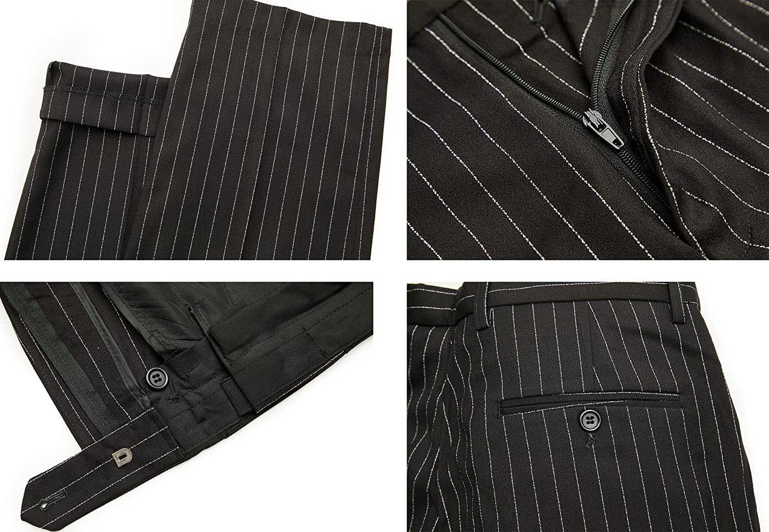 Button Fly closure, slim fit notch lapel flap pocket. Premium center vent two-button single breasted stripe suit jacket with matched four-button vest with back adjustable belt for better fit and classic trousers.