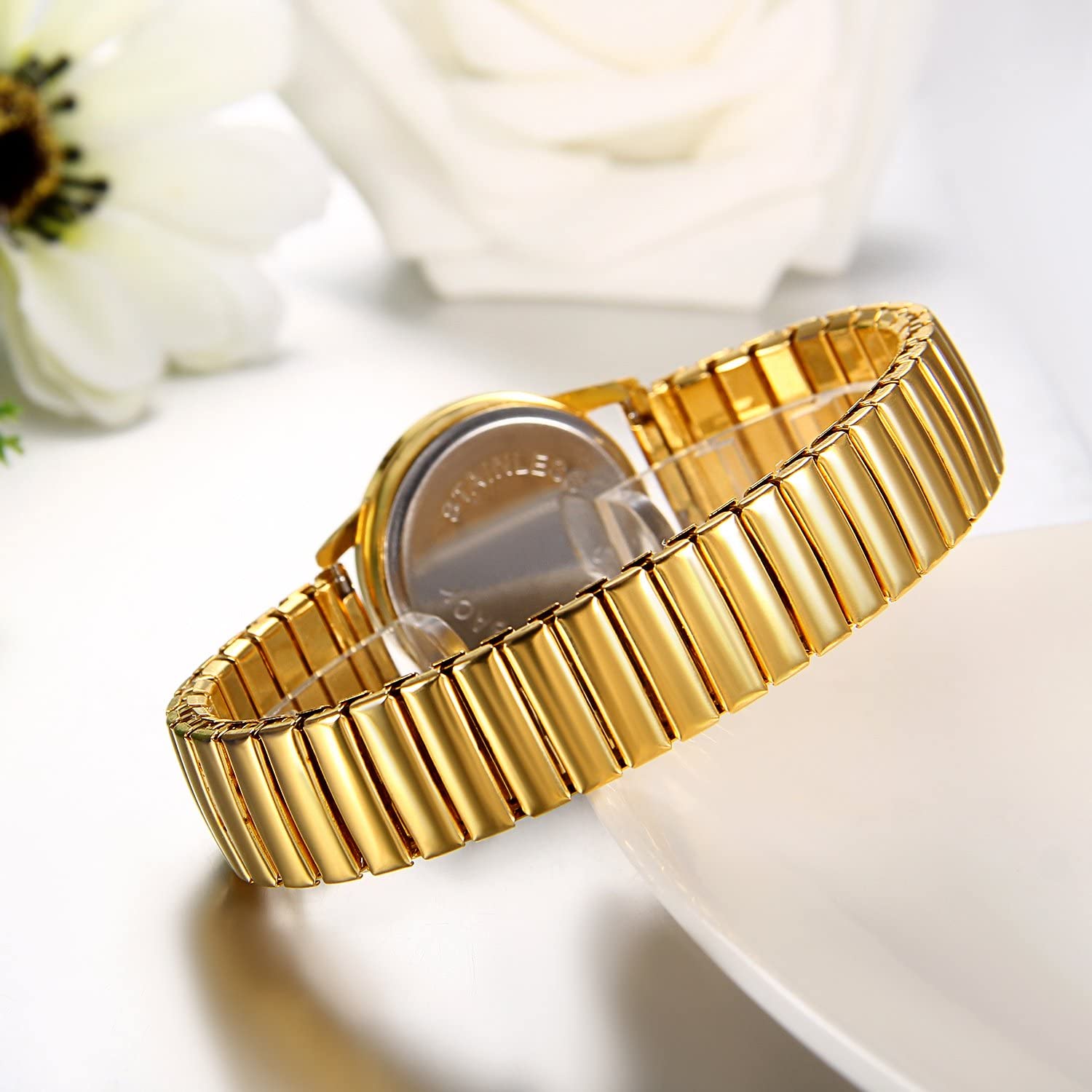 - ?【HIGH QUALITY】Polished Gold-Tone Metal Expansion Band. Stretchable watchband for adjustable size. Easy to put on and take off. Fits wrists size from 17cm-28cm/6.7in-11.02in. Durable premium metal watch case. No more key scratch with the high hardness mineral glass watch face.