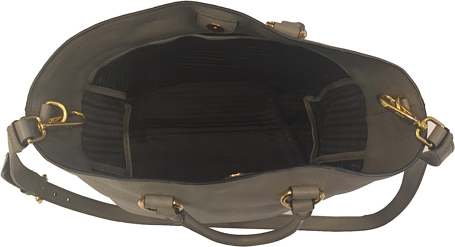 • Prada luxury gray leather shopping tote features a large open interior with two magnetic close slip pockets and one zippered inside pocket. Comes with a nice detachable ID tag and removable, adjustable shoulder strap