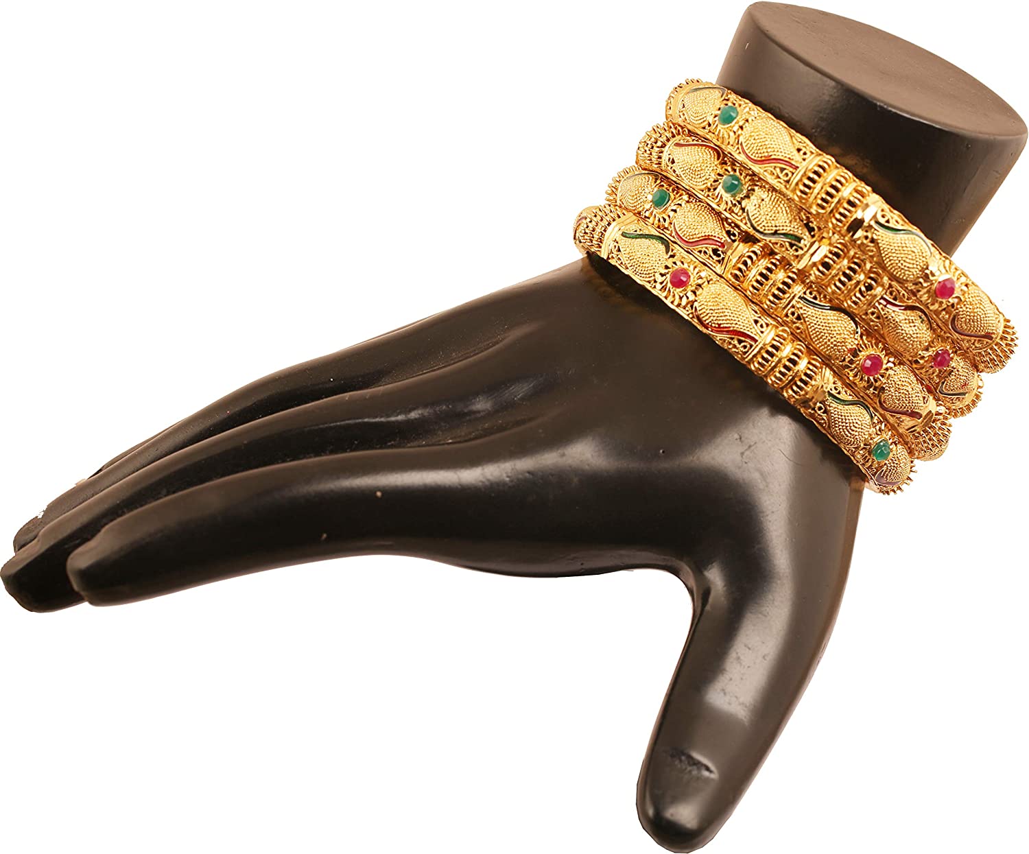 NEW Touchstone "Golden Bangle Collection" Indian Bollywood Desire Beautifully Carved Conch Shell Inspired Faux Ruby Emerald Meena Designer Jewelry Bangle Bracelets. Set of 4. In Gold Tone For Women SIZE : LARGE. Indian Size 2-10. Inner Diameter 2.625 Inches or 6.67 cm. Please check against old Bangle before ordering to avoid disappointment