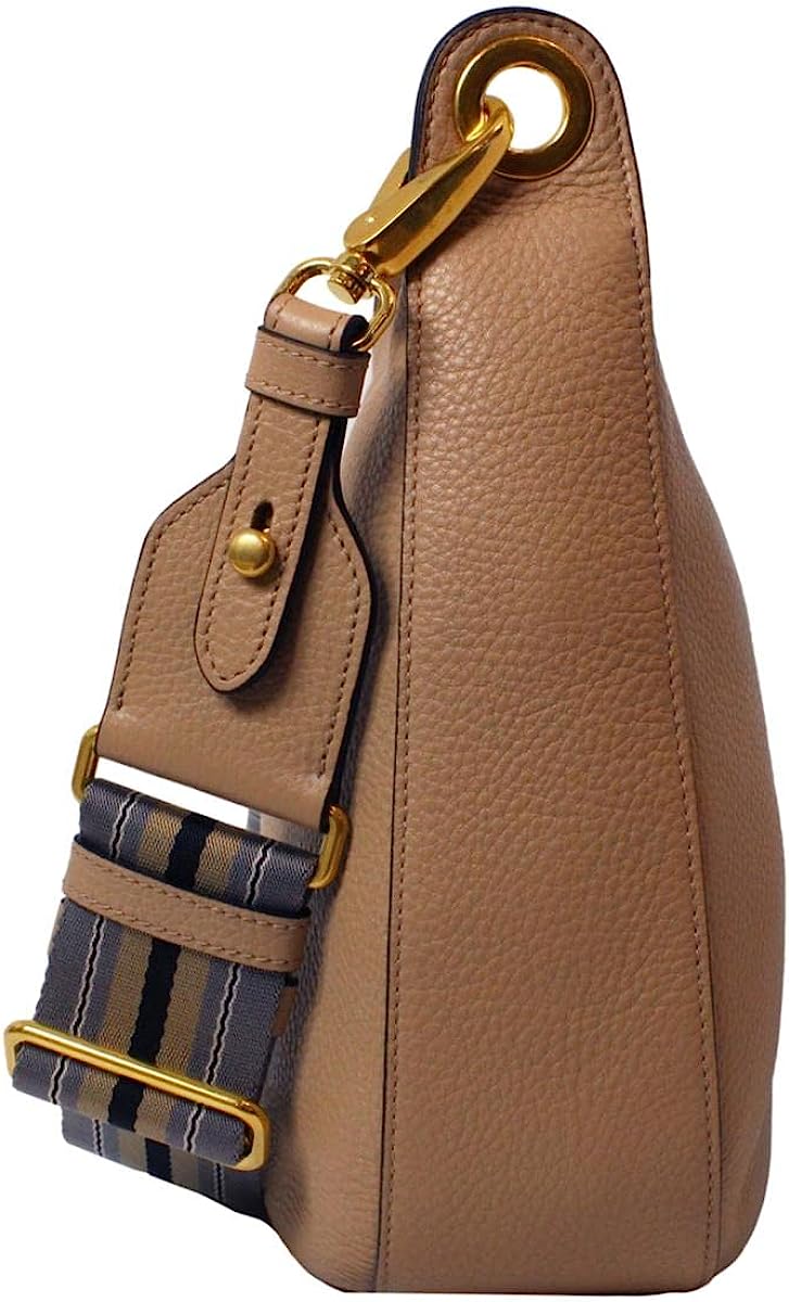 Tan leather with gold Prada Paris logo and silver and blue nylon web striped strap