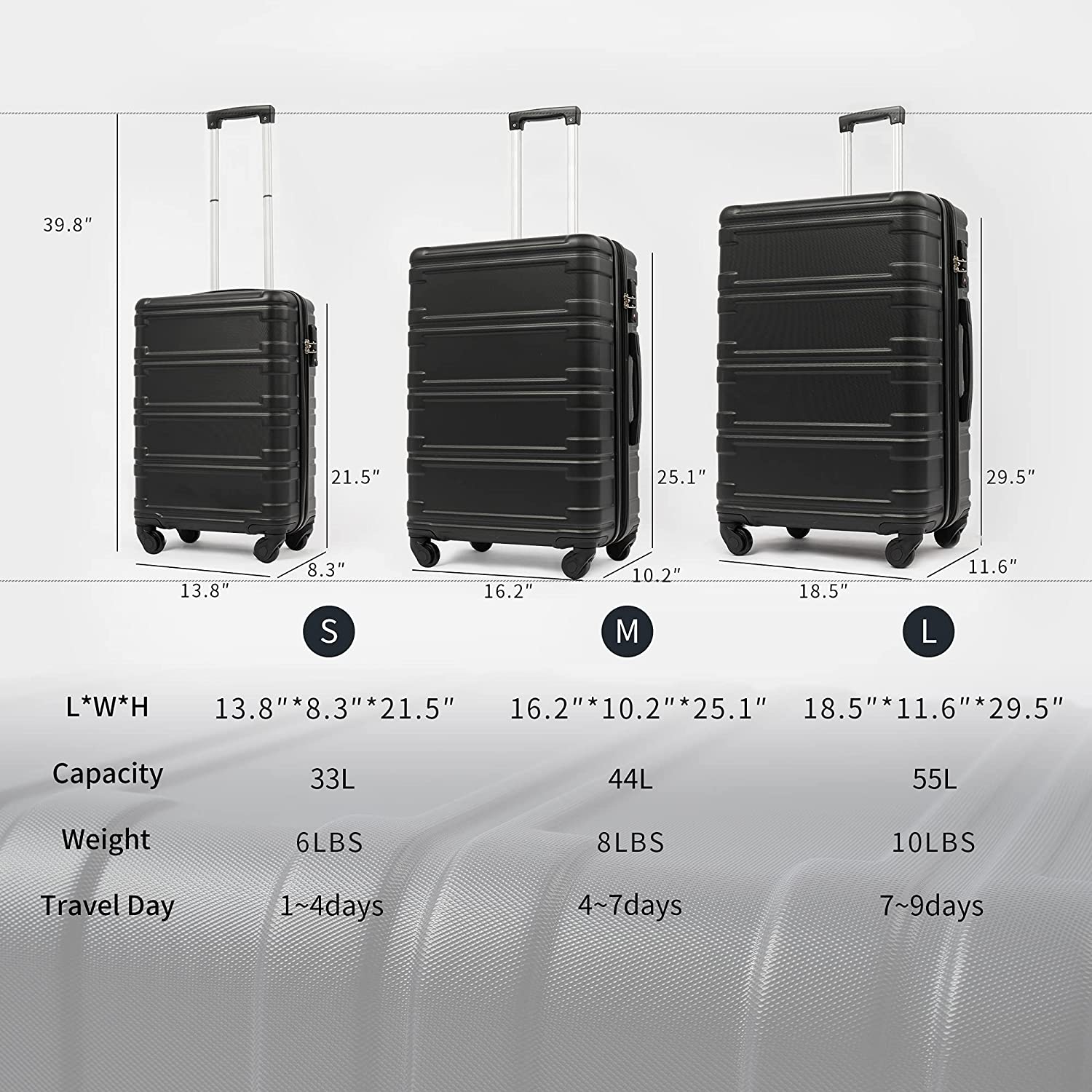 3 piece luggage set to accommodate all your traveling needs. Following sizes of suitcase are included: 20 inches, 24 inches and 28 inches.