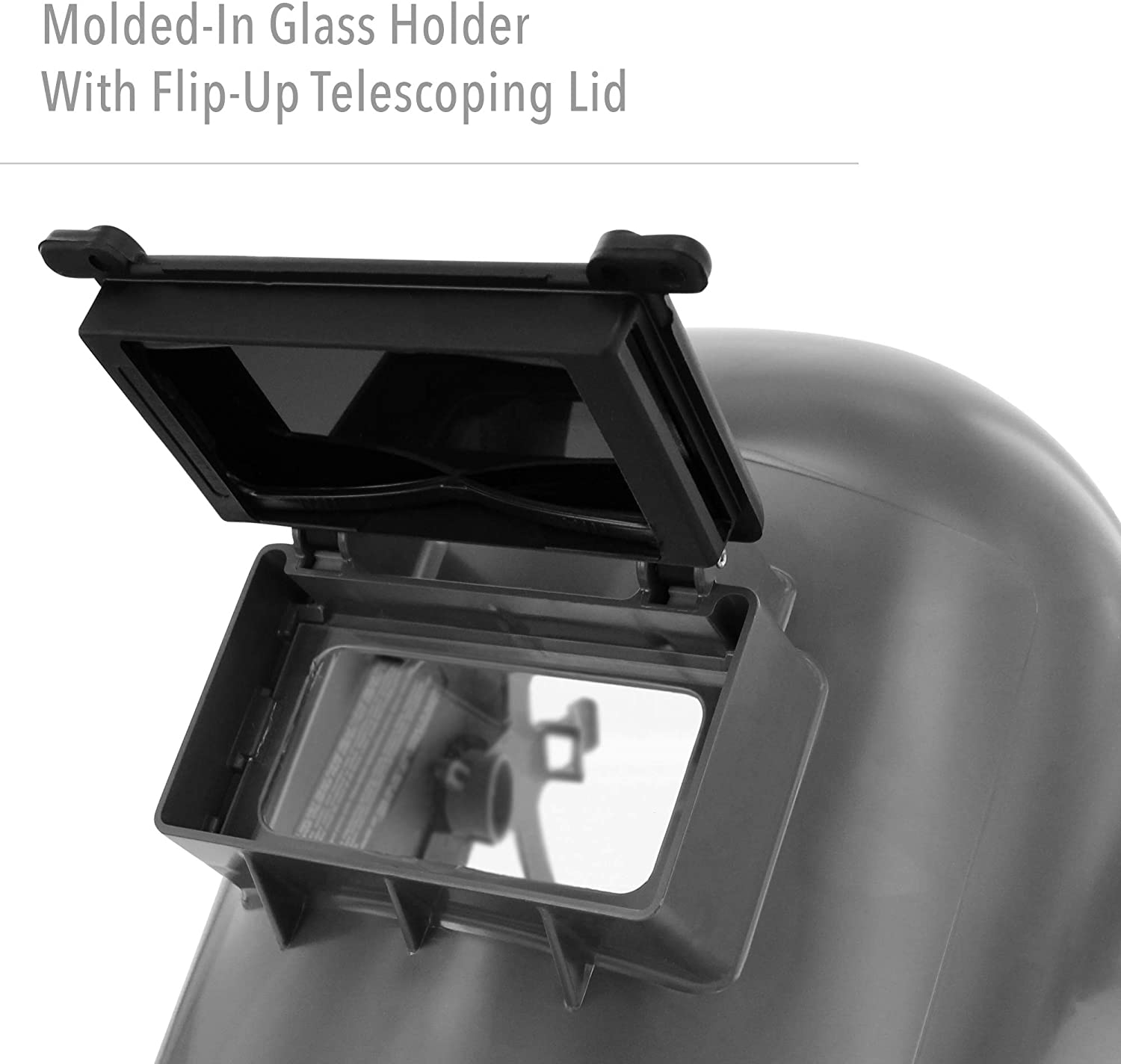 • CLEAR VISION: Molded-in glass holder features unique, flip-up 2 x 4 1⁄4" telescoping lid; lid also provides seal against light-leak; includes shade 10 welding lens; accommodates glasses & respirators