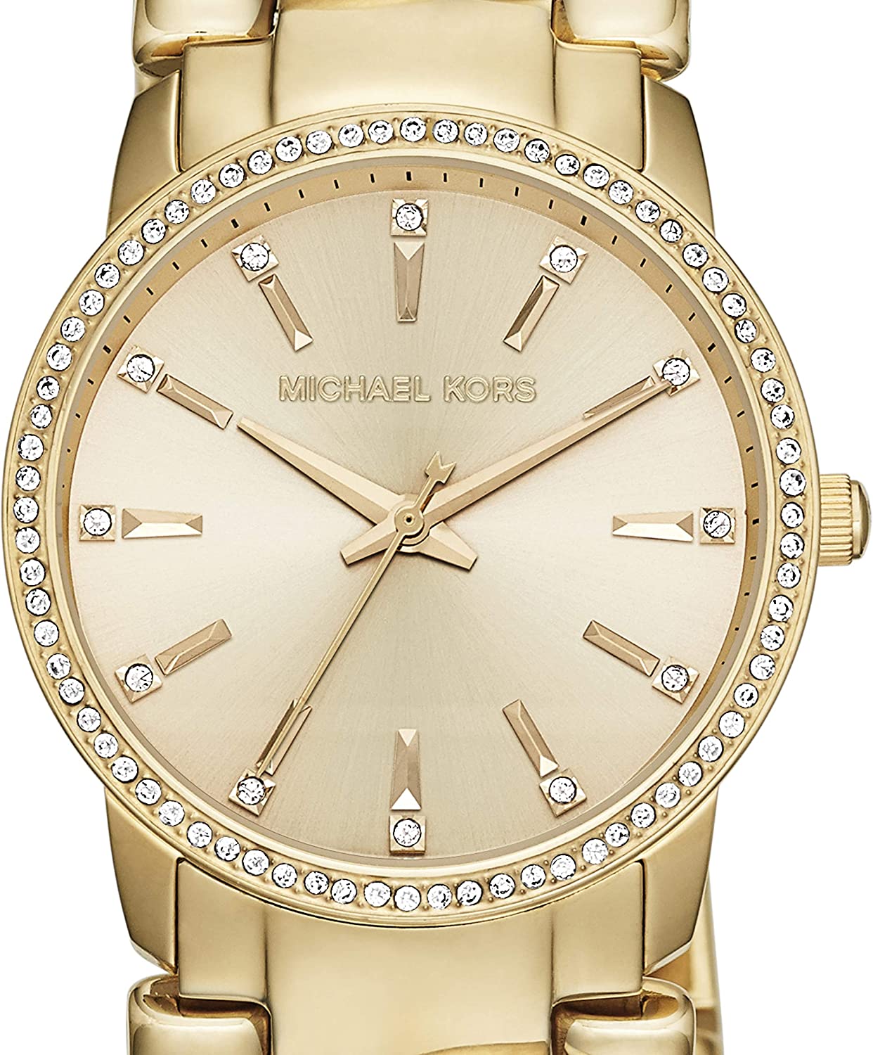 This Michael Kors Women's Lady Nini watch features a monochromatic hands and markers, fixed stainless steel bezel with crystals and a stainless steel case and steel bracelet.