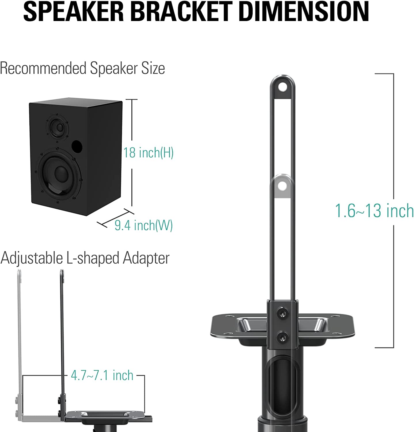 EASY ASSEMBLY - Our speaker stands can be assembled in minutes. With adjustable speaker bracket, these floor speaker stands can work on speakers of MAX size 9.4"(D) x 18"(H) with mounting holes up to 13 inches height