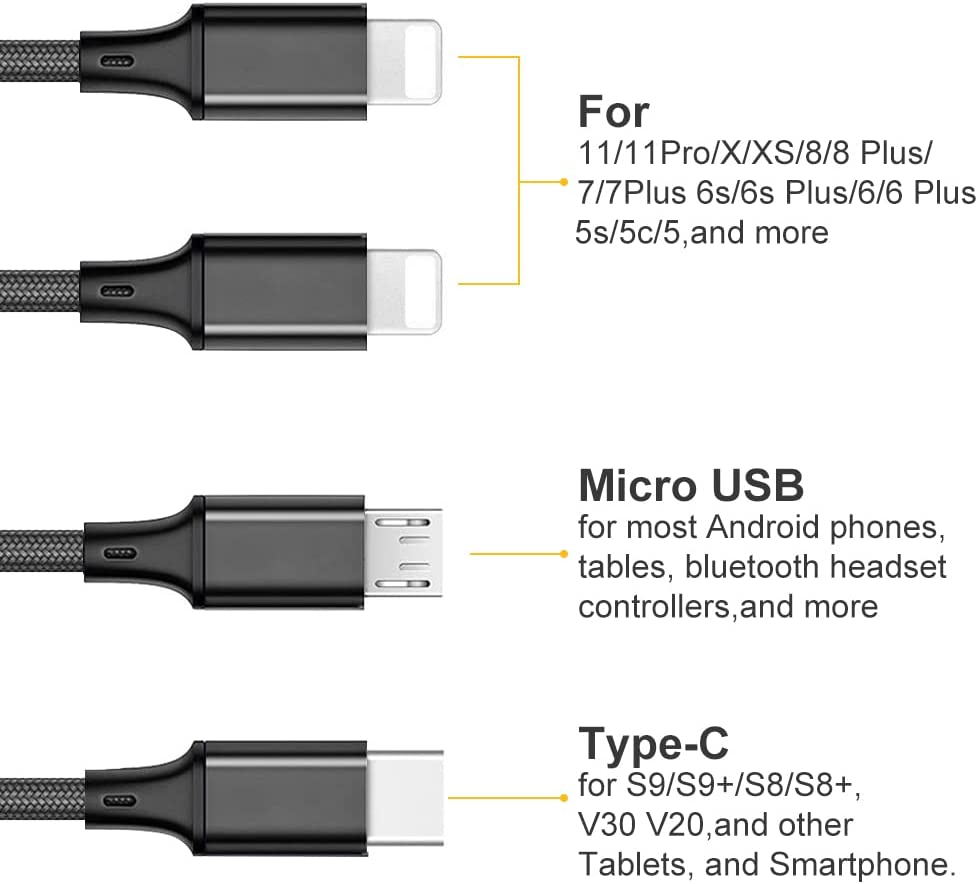 • ✔Incredibly Durable: Comfortable Nylon Braided cord is tangle-free and unbreakable. Over 5000+ bend lifespan makes multi phone charger cable more durable than other cable. In addition, using high-quality heat resistant aluminum alloys terminals to increase reliability and durability. Connector tersted 10000+ times, never in worse connection.