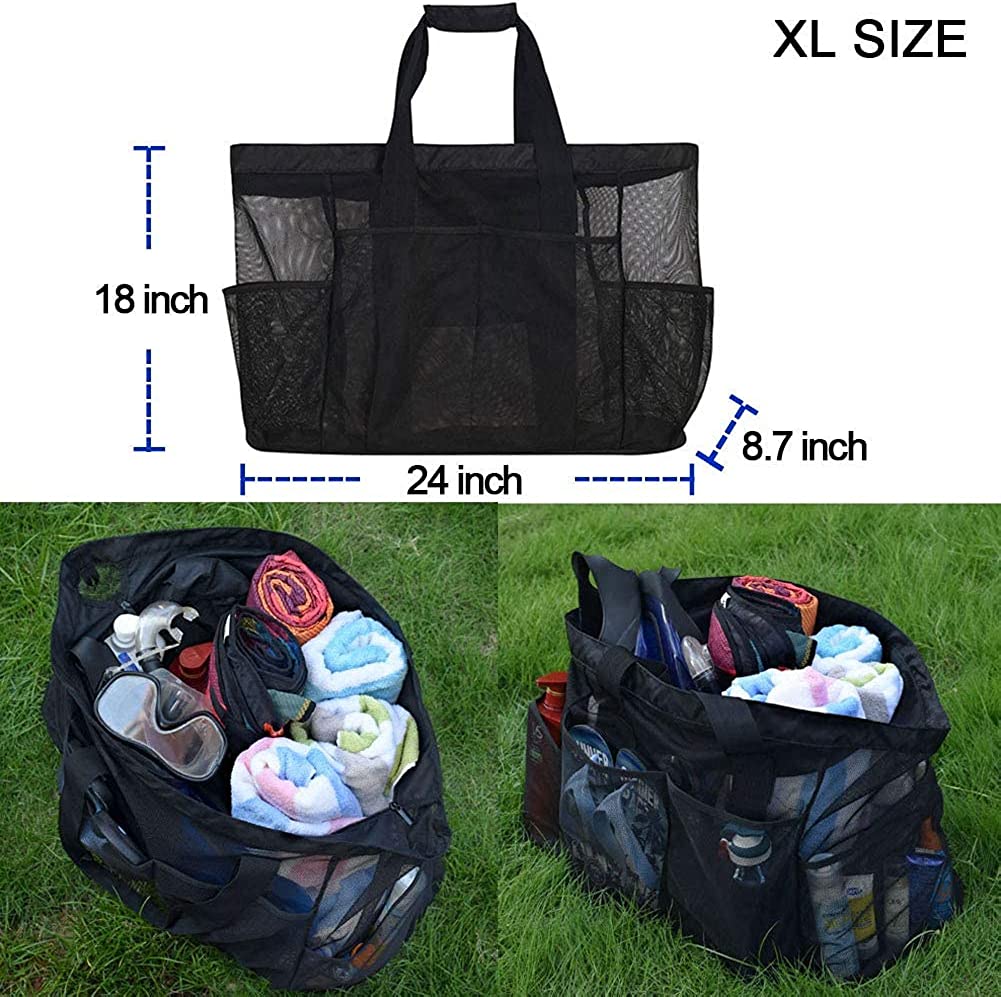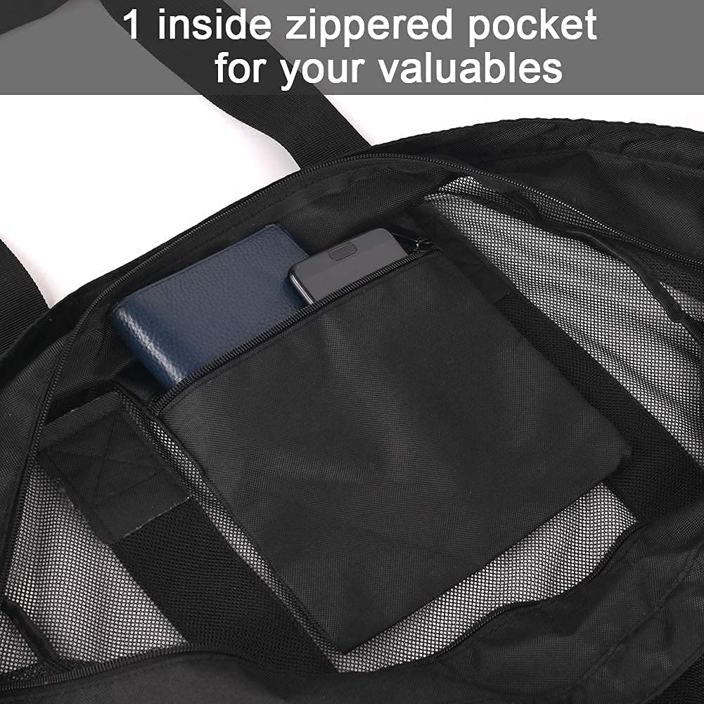 【 WITH MORE EXTRA POCKETS 】 - Our black mesh beach bag with 4 outside pockets and 1 inside zippered pocket. 4 deep outside pockets for your extra stuff like water shoes, water bottles... The 1 inside zippered pocket for your valuables like phone, wallet and key...