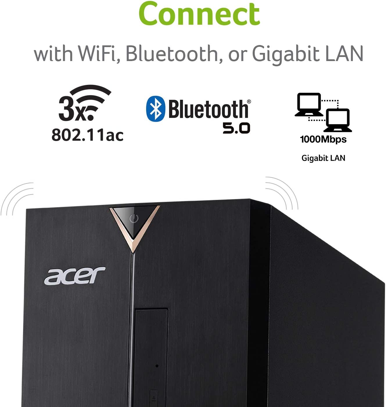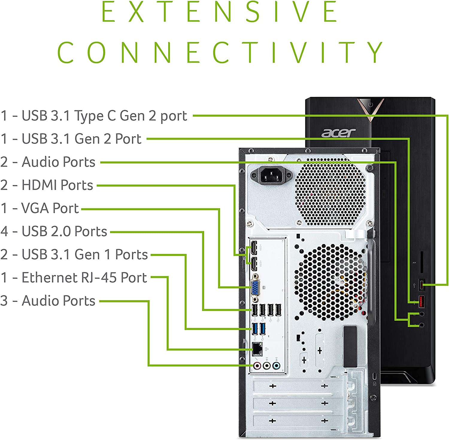 Acer Aspire TC-885-UA92 Desktop PC comes with these specs: 9th Generation Intel Core i5-9400 Processor 2.9GHz with Turbo Boost 2.0 Technology up to 4.1GHz, Windows 10 Home, 12GB DDR4 2666MHz RAM Memory, Intel UHD Graphics 630, 8X DVD-Writer Double-Layer Drive (DVD-RW), 512GB SSD, High-Def Audio with 5.1-Channel Surround Sound Support, 1 - USB 3.1 Type C Gen 2 port (up to 10 Gbps) (Front), 1 - USB 3.1 Gen 2 Port (Front), 2 - USB 3.1 Gen 1 Ports (Rear), 4 - USB 2.0 Ports (Rear), 2 - HDMI Ports (Rear), 1 - VGA Port (Rear), 802.11ac WiFi, 10/100/1000 Gigabit Ethernet LAN (RJ-45 Port), Bluetooth 5.0, 300W Power Supply, USB Keyboard and Optical Mouse, 17.2 lbs. | 7.8 kg (system unit only),Wireless LAN Standard - IEEE 802.11ac.