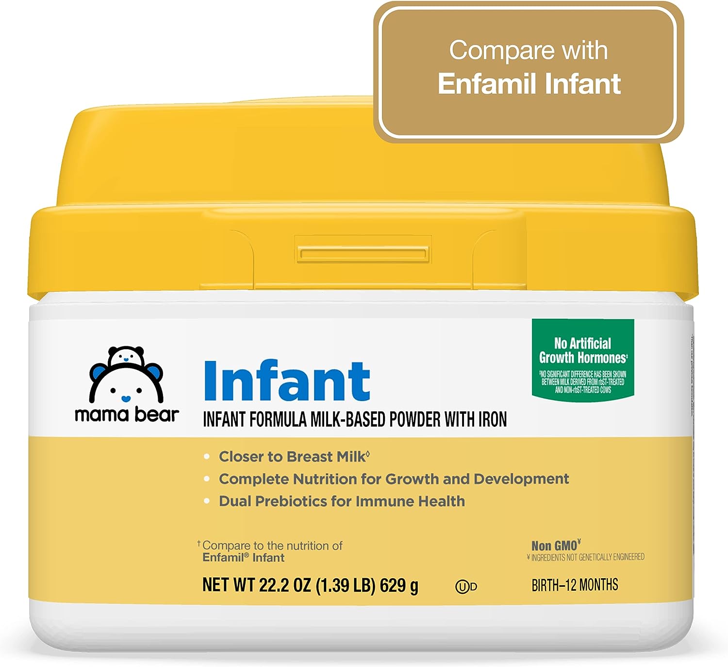 Mama Bear Infant Milk-Based Baby Formula Powder is fortified with iron and closer to breast milk than our previous formulation; Crafted to provide complete nutrition for babies 0-12 months; Compare to Enfamil Infant
