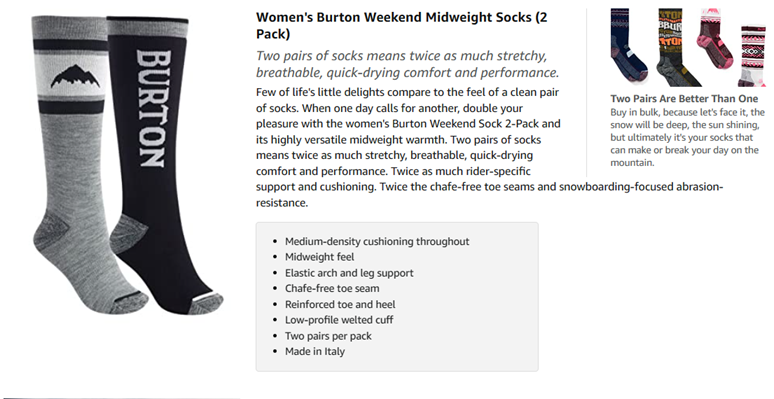 Few of life's little delights compare to the feel of a clean pair of socks. For when one day calls for another, double your pleasure with the women's Burton Weekend Sock two-pack and its highly versatile midweight warmth. Two pairs of socks means twice as much stretchy, breathable, quick-drying comfort, and performance. Twice as much rider-specific support and cushioning. Twice the chafe-free toe seams and snowboarding-focused abrasion-resistance. Buy in bulk, because let's face it, the snow will be deep, the sun shining, but ultimately it's your socks that can make or break your day on the mountain.