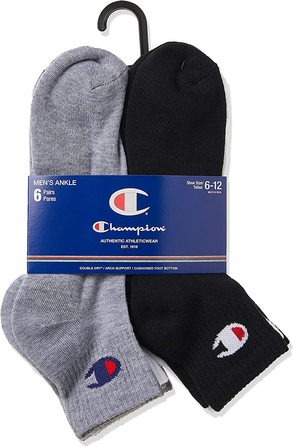 Designed to keep you cool and comfortable, Champion® men’s ankle socks help you power through your routine. Double Dry™ technology wicks moisture so you stay cooler and drier no matter how hard you go. A cushioned footbed acts as a shock absorber so your feet are more protected during a high-impact workout. Arch support ensures a comfortable, secure fit. Crafted from a soft, polyester/spandex blend, these men’s athletic socks hug your foot and hit at the ankle. The cherry on top? All pairs of this socks multipack feature the iconic knit-in C logo for a boost of pure Champion style.
