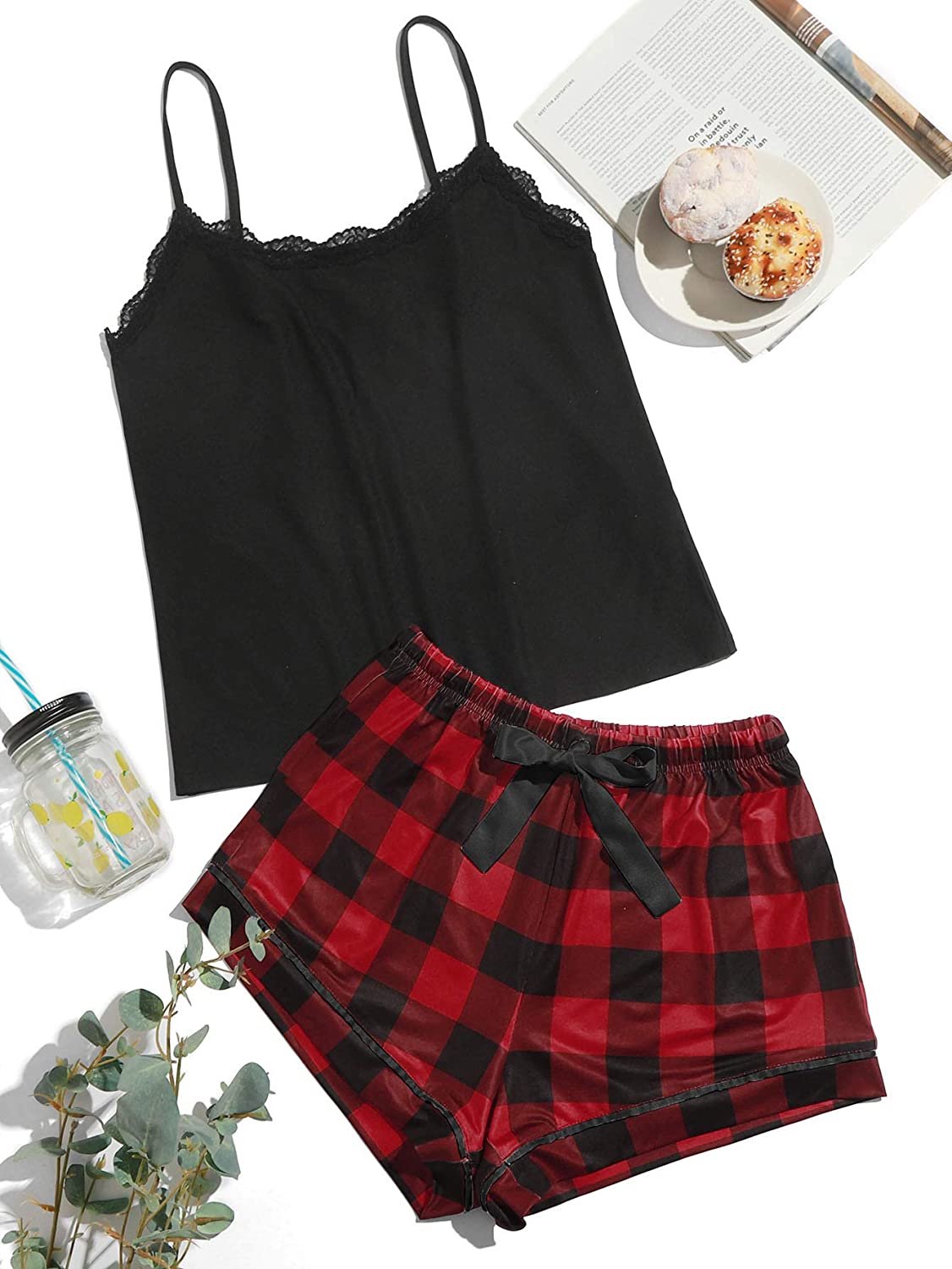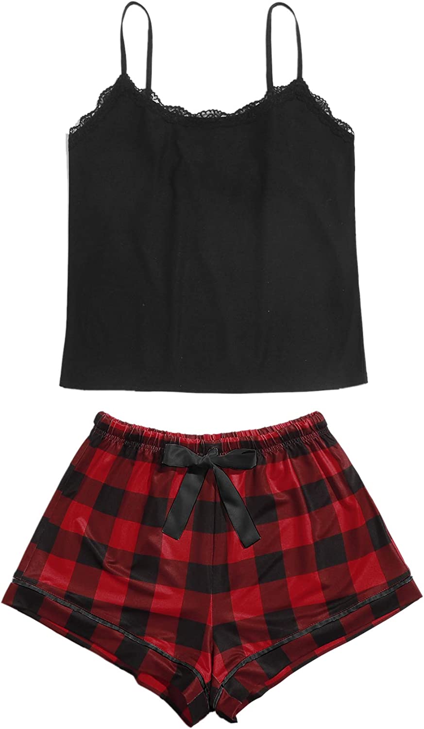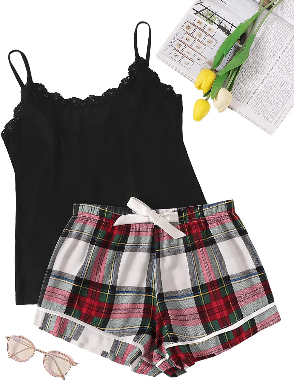 SweatyRocks Women's Sleepwear Set Plaid Print Cami Top and Elastic Waist Short Pajama Set