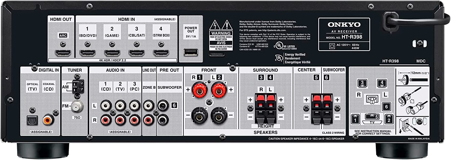 Onkyo HT-S3910 Home Audio Theater Receiver and Speaker Package. Experience the ultimate in pure sound flexibility. The powerful yet compact HT-S3910 transforms tinny TV sound into a thrilling sonic sensation with Dolby Atmos and DTS playback through 3.1.2 channels. Legacy soundtracks are remapped to localize sound and add height dimensionality, or enjoy 3D immersion without height or rear speakers connected thanks to Dolby Atmos Height Virtualizer and DTS Virtual technologies. Everything you need is in the box, right down to cables to connect factory-matched speakers. These full-range units love high-current power, so turn it up and enjoy home entertainment as it’s meant to be. FEATURES: Package Includes: (1) Front/Center Speaker, (4) Surround Speakers, (1) Subwoofer and (1) Receiver. Cables included. 4K HDR Support for HDR (High Dynamic Range) video. 4K/60p and HDR (HDR10, hlg, Dolby vision, BT.2020). Power an HDMI network dongle via USB terminal or enjoy streaming audio with Bluetooth technology. Advanced Music Optimizer works magic on lossy audio.