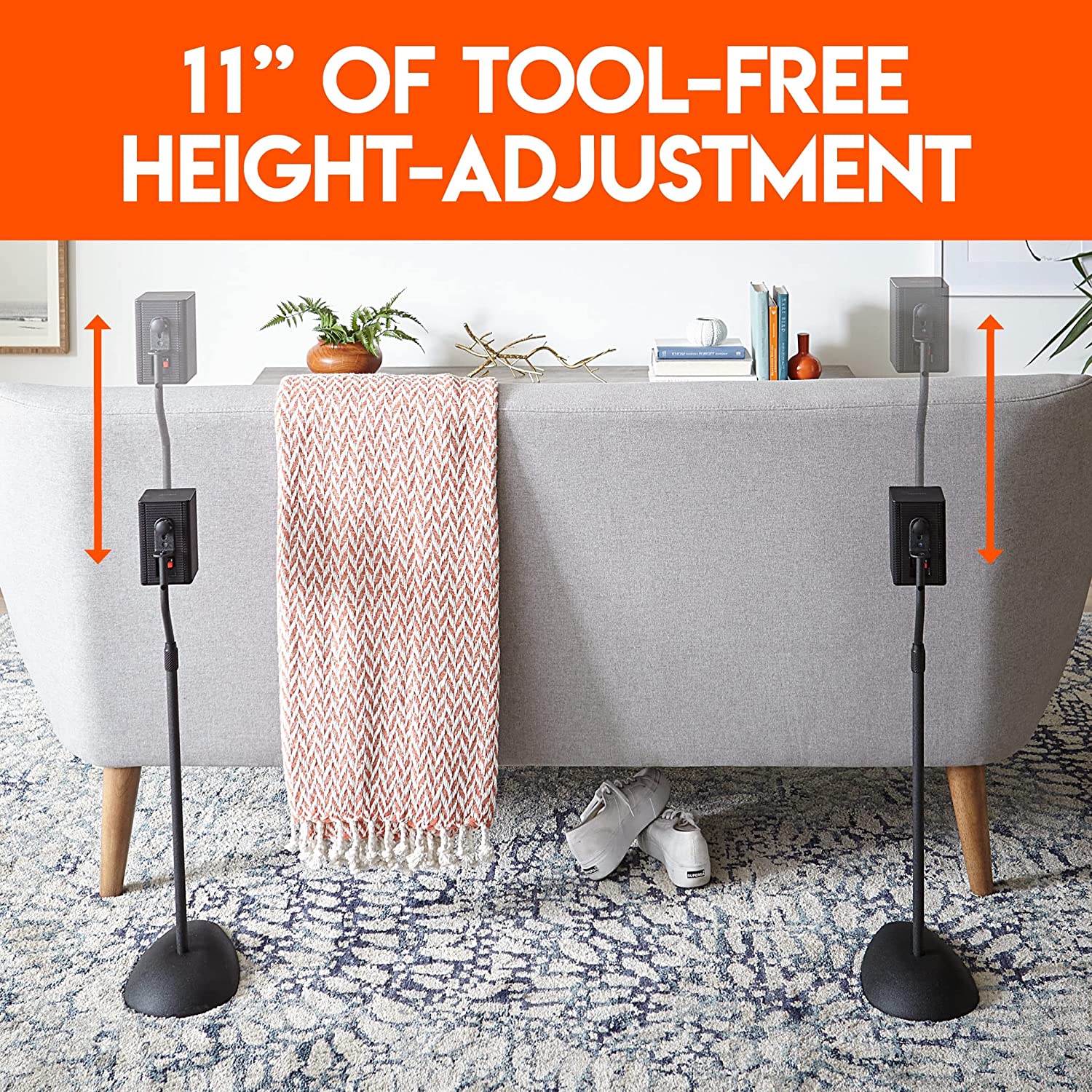 Adjust speaker height up to 11" with no tools required. Just turn the collar to change height on-demand. Now your speakers will always be at the perfect height.