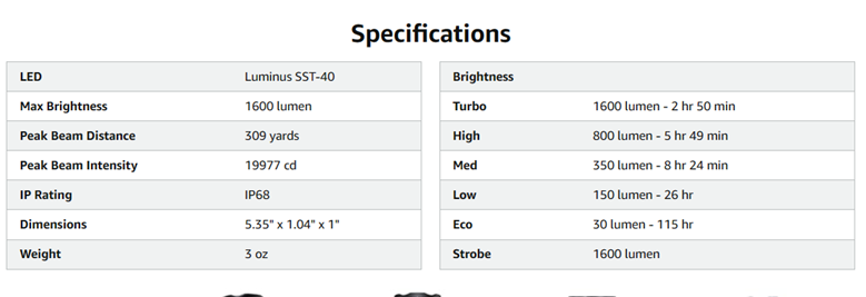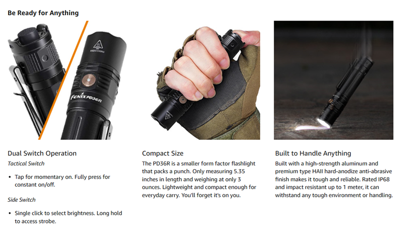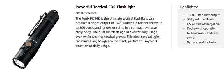 Included Components | Holster, PD36R Rechargeable flashlight, Charging Cable, LumenTac Organizer |