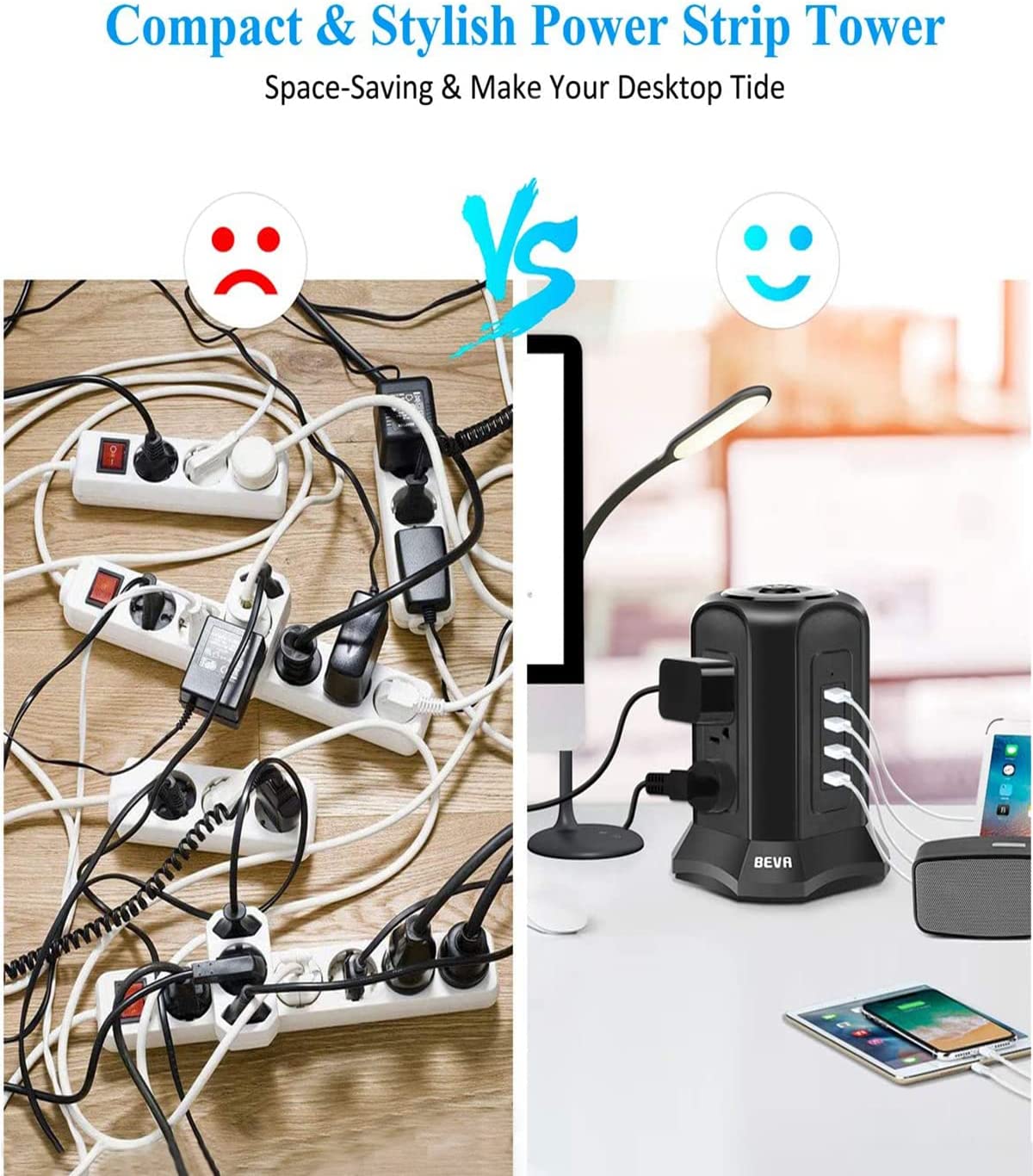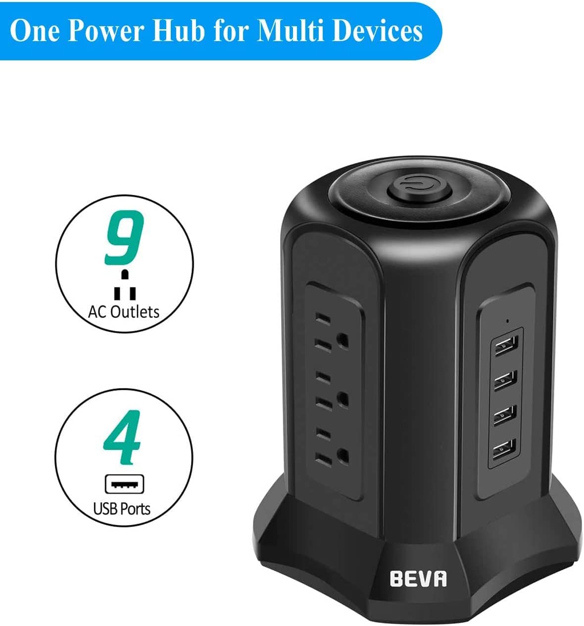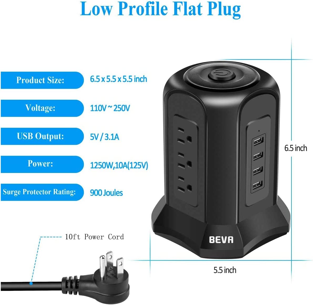 Power Strip Tower Surge Protector BEVA 10ft Flat Plug Desktop Charging Station 9 AC Outlets 4 USB Ports, 900 Joules, Long Extension Cord for Home Office Appliances Smartphones Computer Tablets(Black)