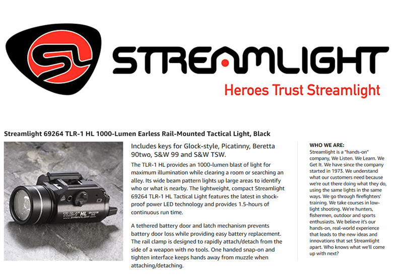 The Streamlight 69264 TLR-1 HL is a lightweight, compact, lithium battery powered gun-mounted tactical flashlight featuring the latest in shock-proof high power LED technology and providing 1.5 hours of continuous run time with 1000-lumens. Tethered battery door and latch mechanism prevents battery door loss while providing easy battery replacement. When enabled, the strobe is activated on two or more momentary paddle hits. Mounts directly to handguns with Glock-style rails and to all MIL-STD-1913 (Picatinny) Rails, however; kindly confirm fitment and compatibility prior to purchase. The Streamlight 69264 includes keys for Glock-Style, Picatinny, Beretta 90two, S&W 99 and S&W TSW handguns.