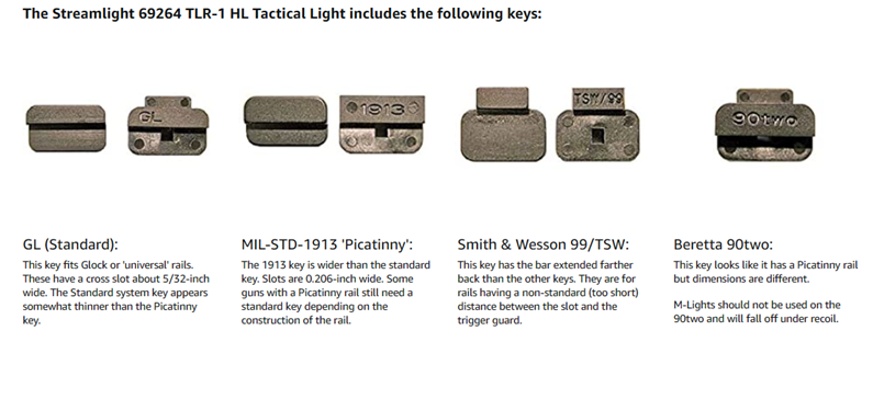 SIG SAUER: GSR or 1911 Style with flat bottom rail - Picatinny key. ANY ALUMINUM FRAME SIG WITH A ROUND BOTTOM RAIL: Including the P220R, P229R, etc. The Sig round bottom rail departs form the true shape of both the 1913 and Universal standards and may cause an improper fit. The TLR will work with the 1913 key but THERE WILL BE DAMAGE to the finish of both the gun and the light. The retaining screw must be TIGHT. Newer Sig P series guns are supposed to have a true Picatinny rail. This has not been verified by Streamlight. SP2022 – Polymer frame. Same comments as for aluminum frames, EXCEPT that the polymer frame is a little thicker and does not show marks from a clamp because it is molded from black material. PER SIG, the TLR with the 1913 key works. SMITH & WESSON: On the TSW and 99 models, the slot is too far back for the standard key and requires the special S&W key. There are many different models of TSW but as long as it's a TSW WITH A RAIL, it uses the S&W key. Smith & Wesson M&P autoloader takes the Picatinny key. SIGMA – CANNOT FIT.