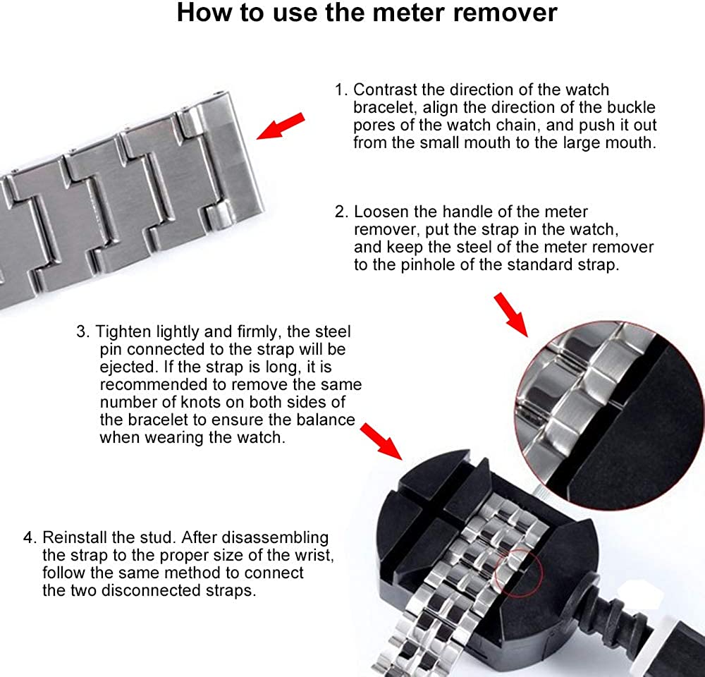 - ? PACKAGE & BUY WITH CONFIDENT: Comes with ADJUSTMENT TOOL, you can remove the link and shorten the band length if the band is long and not fit for your wrist. You can find the usage of the adjustment tool in the main picture on the left.Please be attention:package not include cleaning cloth!Always feel comfortable to contact us if there's any problem with the product!