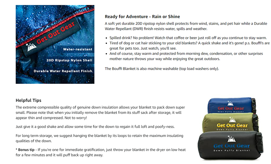 Get Out Gear Down Camping Blanket - Puffy, Packable, Lightweight and Warm | Ideal for Outdoors, Travel, Stadium, Festivals, Beach, Hammock | 650 Fill Power Water-Resistant Backpacking Quilt