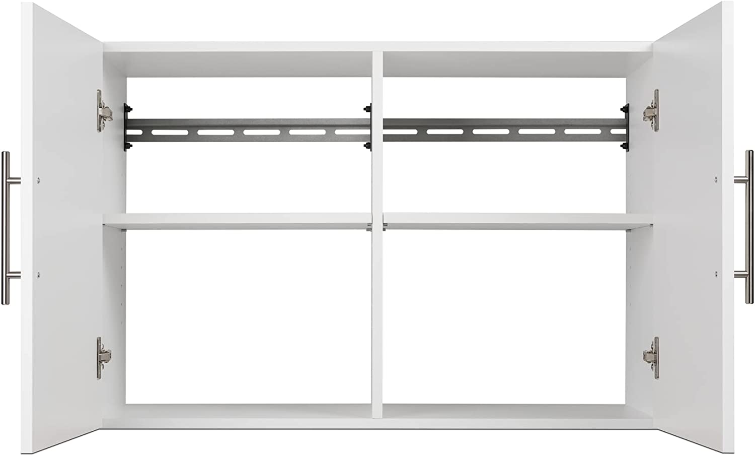 WALL MOUNTED OVERHEAD CUPBOARD: Secures onto most standard walls and features 2 clean line doors and 2 adjustable shelves with a central divider in a crisp white laminate finish with satin nickel-finished metal handles